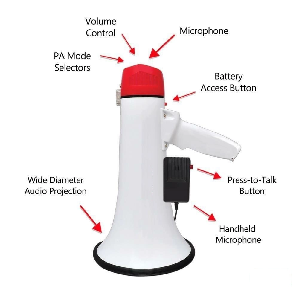 Megafon oferuje zasięg dźwięku do 1000 metrów (w spokojnych warunkach), a dodatkowo funkcja syreny umożliwia natychmiastowe przyciągnięcie uwagi. Dzięki mocy 45W doskonale nadaje się na boiska sportowe oraz mniejsze demonstracje. Megafon zasilany jest zarówno przez akumulator, jak i 6 baterii D-cell (brak w zestawie), a składany uchwyt pistoletowy ułatwia jego przenoszenie i użytkowanie w dowolnym miejscu.