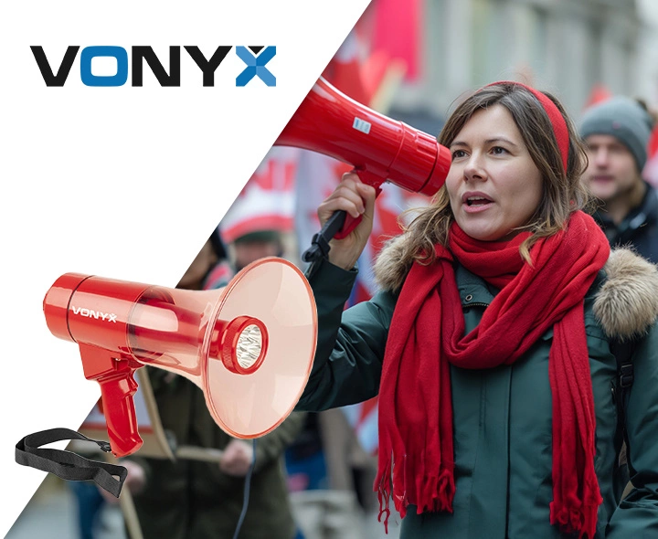 Megafon 50W Vonyx czerwony ze światłem LED BT USB syrena szczekaczka na pochody marsze wystąpienia demonstracje