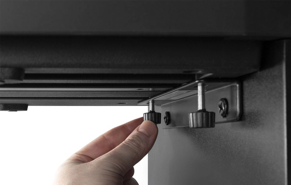 - Regulowana wysokość siedziska za pomocą pokręteł po bokach: od 45 cm do 55 cm, co pozwala na dopasowanie wysokości do wzrostu pianisty.