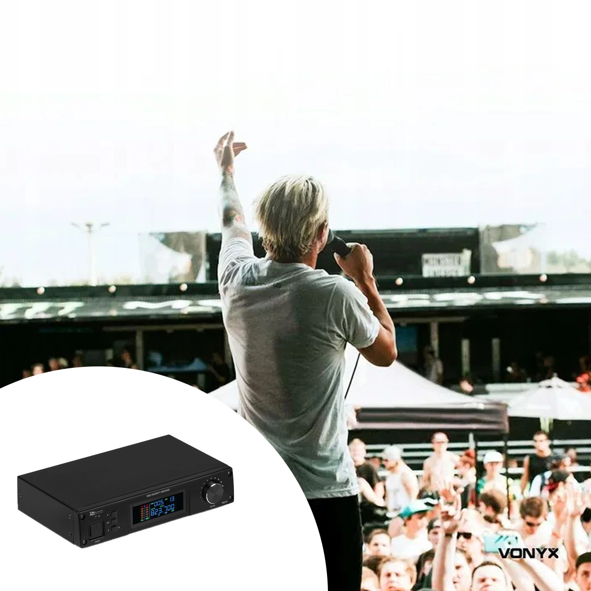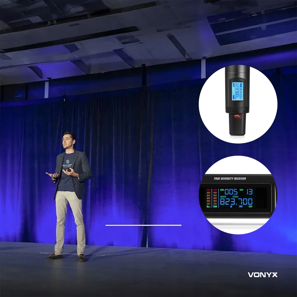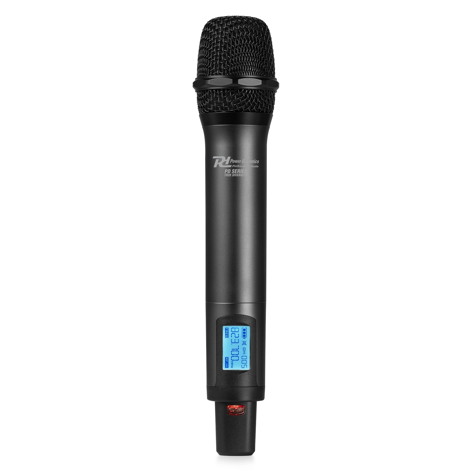 Bezprzewodowy mikrofon oferuje doskonałą jakość dźwięku i wygodę użytkowania. Dzięki solidnej konstrukcji pewnie leży w dłoni. Wyświetlacz pokazuje używany kanał (z dostępnych 160), ustawioną częstotliwość oraz poziom naładowania baterii. Wymiana baterii jest szybka i łatwa – wystarczy użyć dwóch baterii AA (nie są dołączone do zestawu). Mikrofon wyposażono także w przycisk wyciszenia, który pozwala na chwilowe wyłączenie dźwięku bez utraty połączenia.