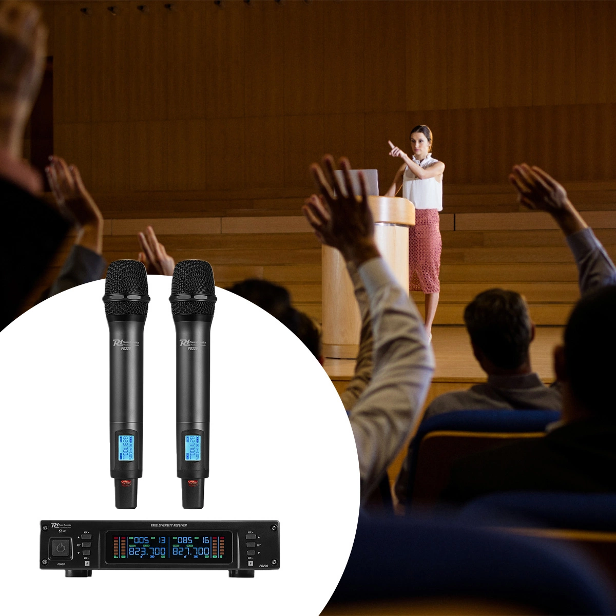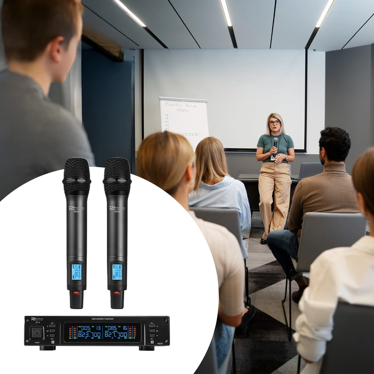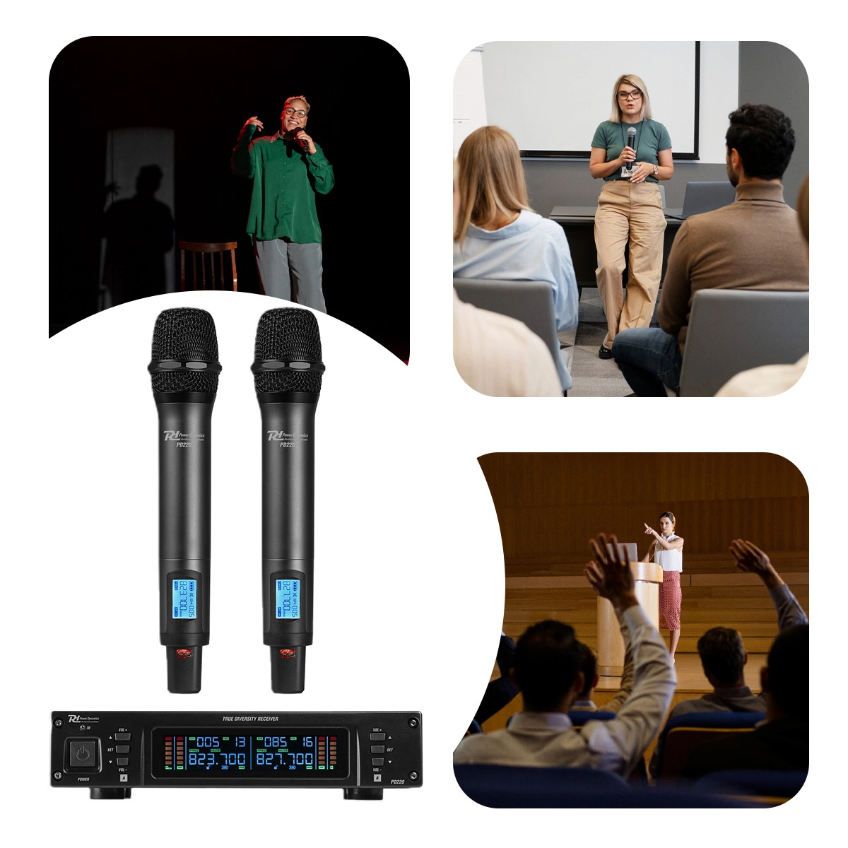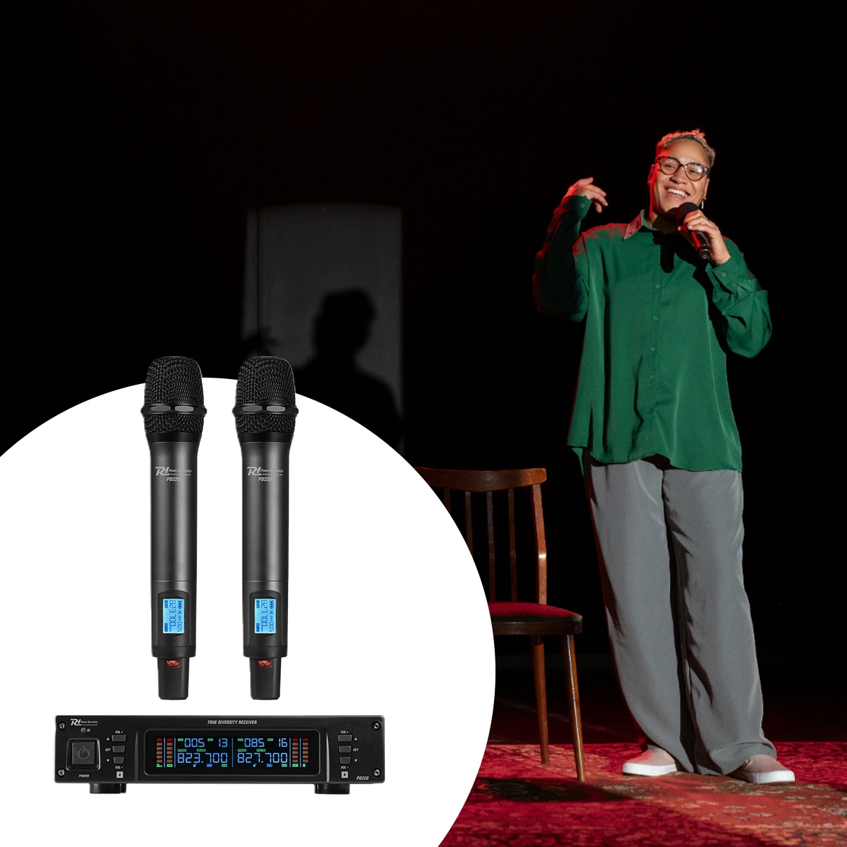 Zestaw zawiera dwa bezprzewodowe mikrofony zapewniające doskonałą jakość dźwięku i wygodę użytkowania. Mikrofony są solidne i dobrze leżą w dłoni. Na wyświetlaczu widoczne są informacje o używanym kanale (spośród 80 dostępnych), ustawionej częstotliwości oraz poziomie naładowania baterii. Niski poziom baterii jest sygnalizowany na ekranie, co pozwala na szybką wymianę. Mikrofony wymagają dwóch baterii AA (nie dołączone do zestawu). Dodatkowo wyposażono je w przycisk wyciszenia (mute), który umożliwia tymczasowe wyłączenie mikrofonu bez utraty połączenia.
