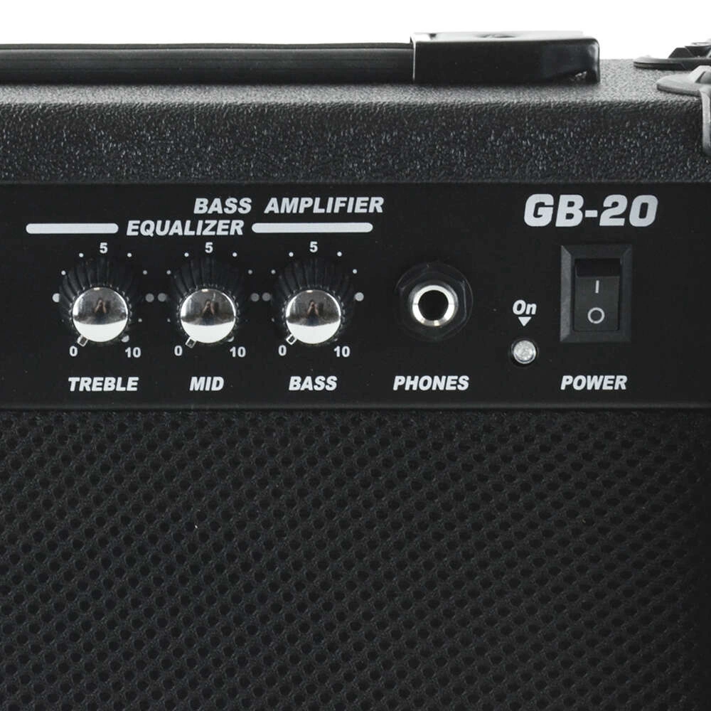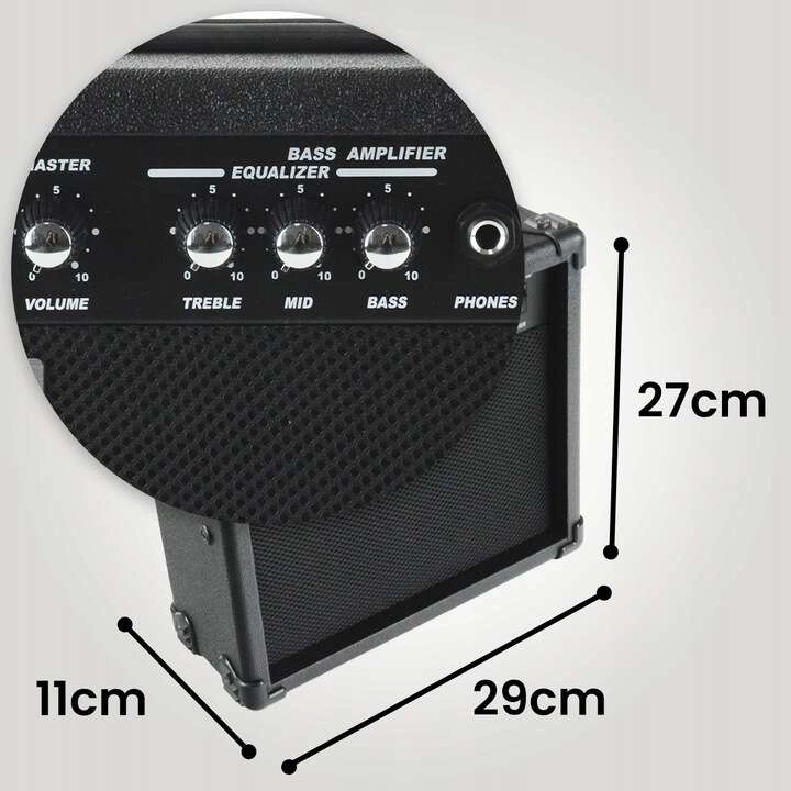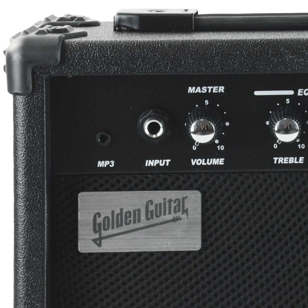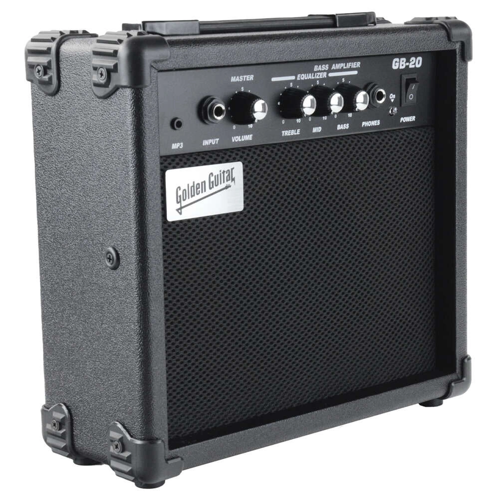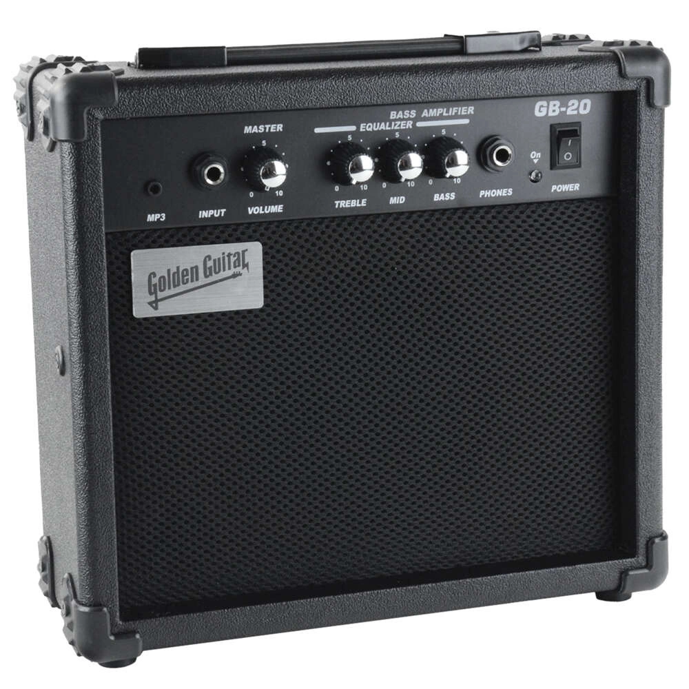 itara elektryczna basowa i wzmacniacz to idealnie dopasowany duet, dlatego w zestawie znajduje się również kompaktowy wzmacniacz basowy Golden Guitar, zwany potocznie "piecykiem". Urządzenie oferuje moc 20W i jest wyposażone w 5'', zamknięty w eleganckiej, klasycznej czarnej obudowie.