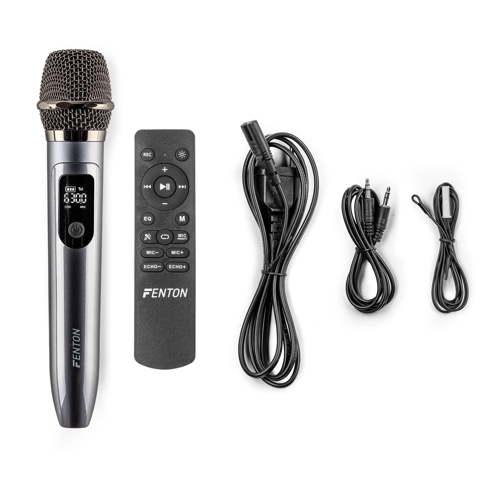 - Zestaw zawiera mikrofon bezprzewodowy (UHF) oraz pilot