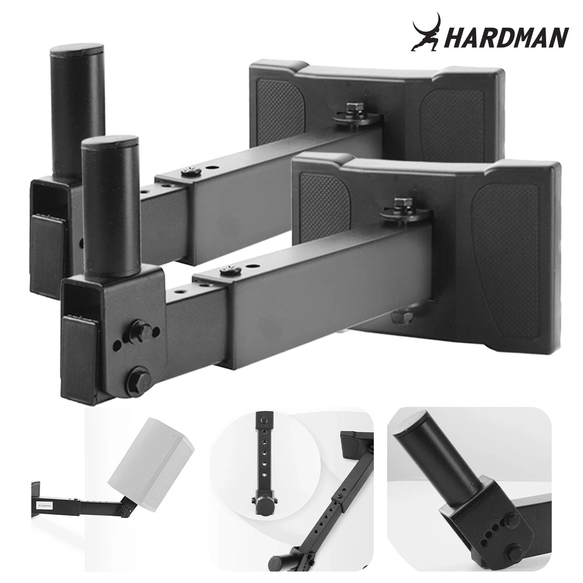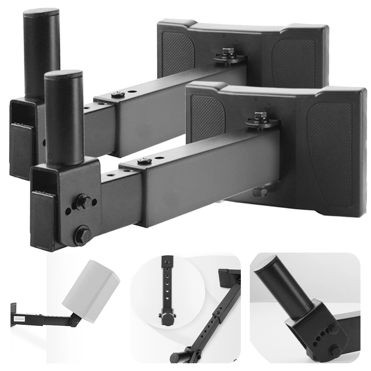 Zakres regulacji od ściany czy innej struktury montażowej: od 34cm do 43cm, pozwala na elastyczne dopasowanie do różnych układów pomieszczeń i specyficznych potrzeb użytkownika. Dzięki temu statywy można zamontować w sposób optymalizujący akustykę wnętrza oraz zapewniający najlepsze rozprowadzenie dźwięku.