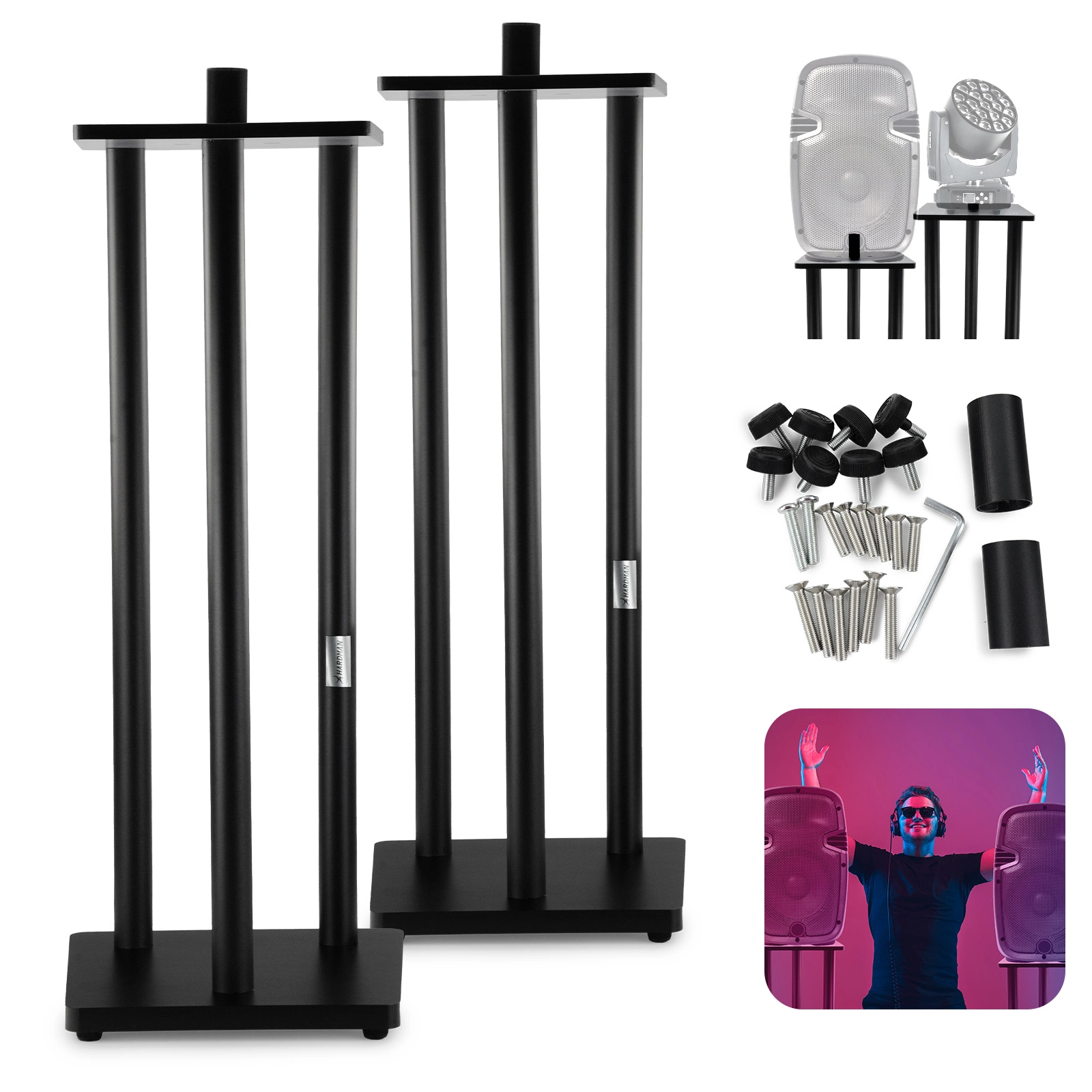 Wszechstronna i stabilna podstawa typu tower, idealna pod kolumny głośnikowe, ruchome głowy, efekty oświetleniowe oraz pod różnorodny sprzęt sceniczny. Dzięki swojej solidnej konstrukcji zapewnia bezpieczeństwo i niezawodność podczas użytkowania. Statywy te to doskonałe rozwiązanie do profesjonalnej oprawy wizualnej stanowisk DJ-skich, scen koncertowych oraz eventów, gdzie liczy się zarówno estetyka, jak i funkcjonalność.