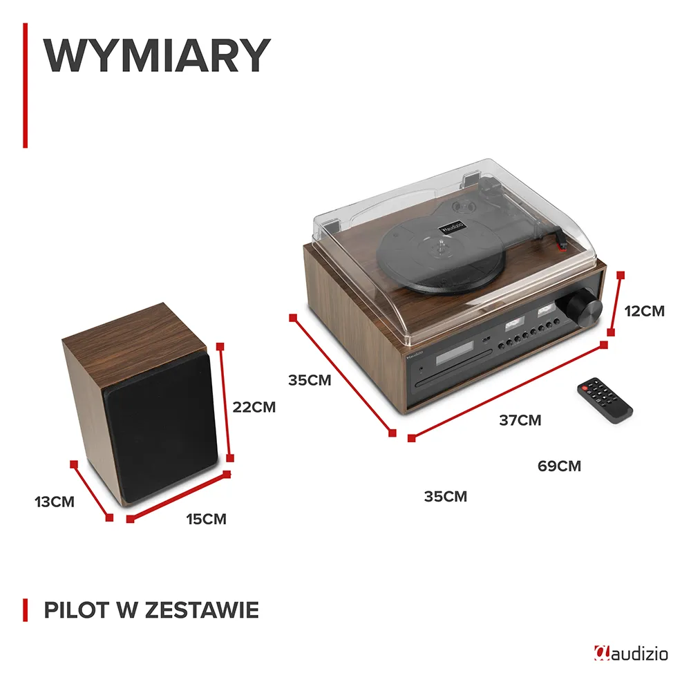 - Wymiary (dł. x szer. x wys.) gramofon: 366x 118x 294mm głośnik: 150x 221x 130mm