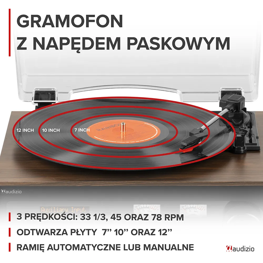 - Odtwarza płyty winylowe w formatach 7", 10" i 12"