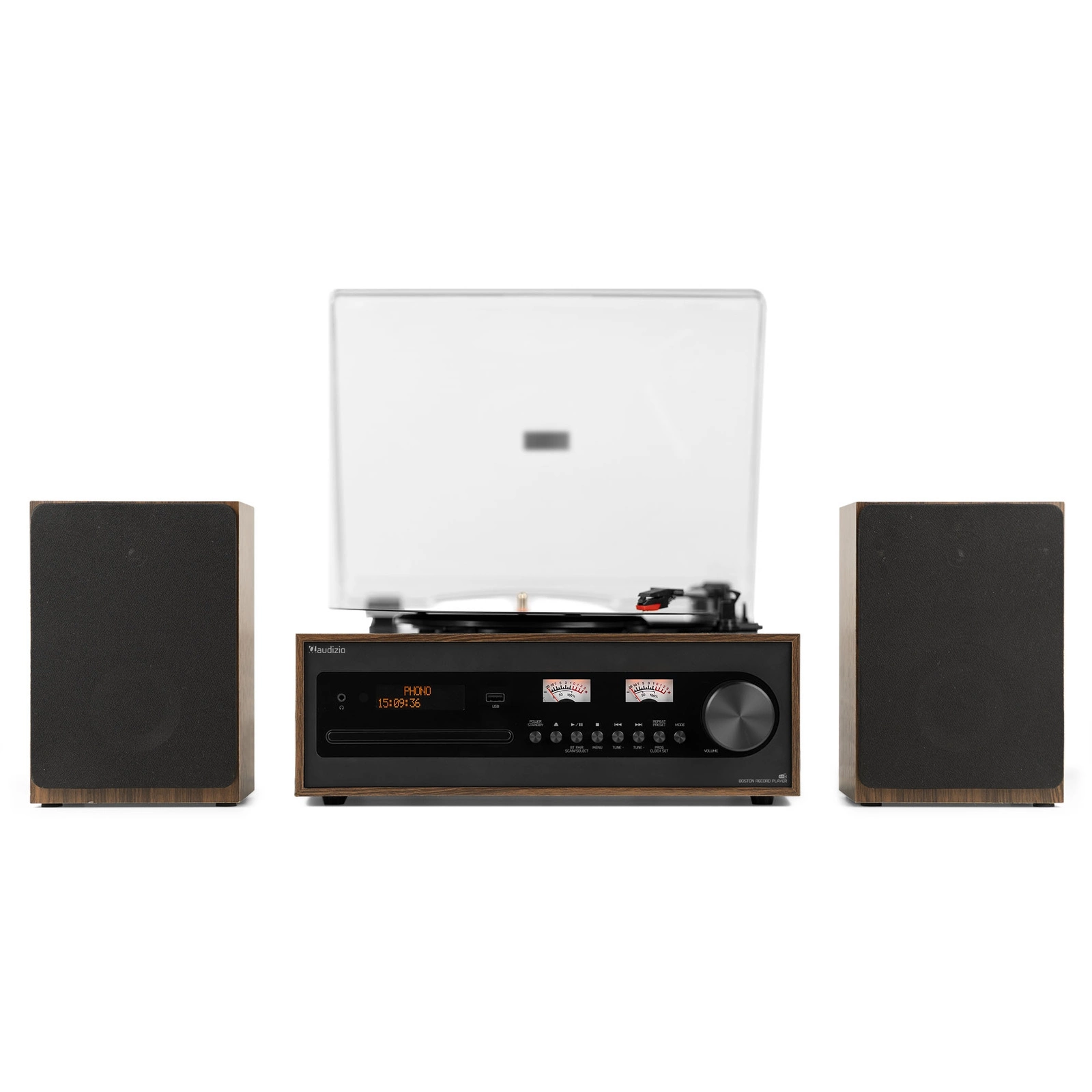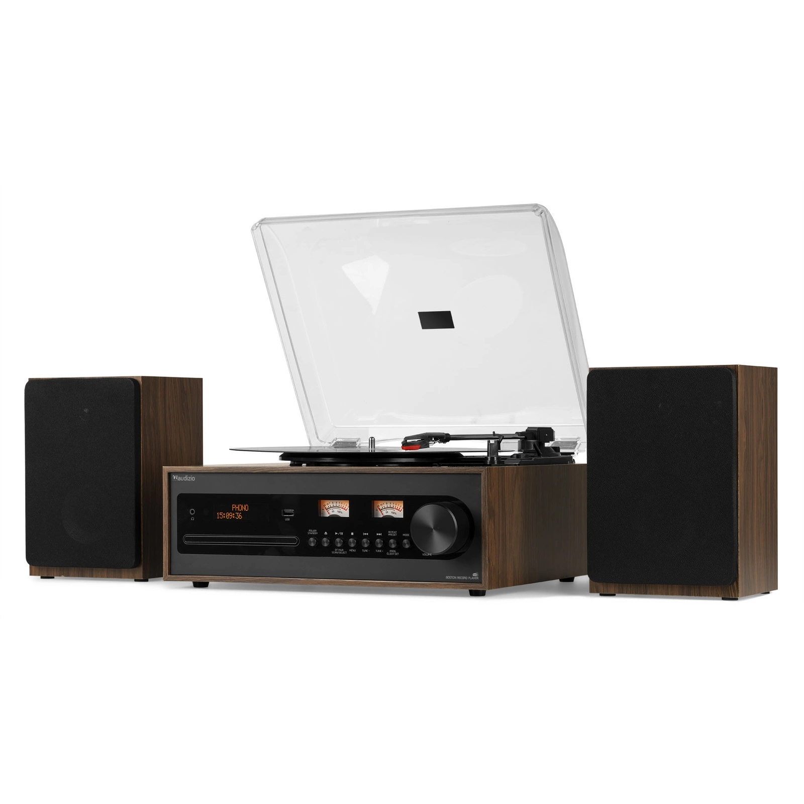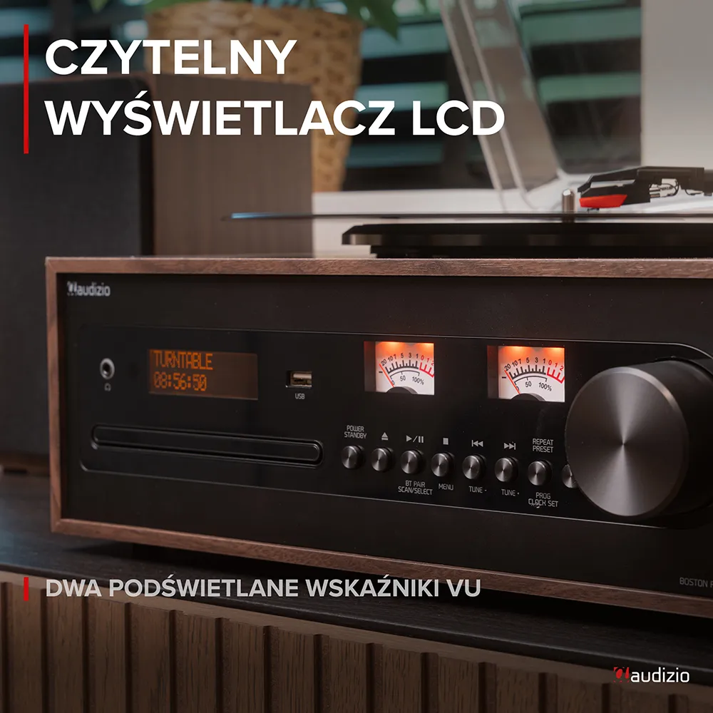 Audizio Boston to retro gramofon, który obsługuje trzy prędkości odtwarzania (33 1/3, 45 i 78 RPM), dzięki czemu możesz słuchać zarówno singli (7 cali), jak i większych płyt (10 i 12 cali). Po zakończeniu odtwarzania igła może automatycznie się zatrzymać, albo – jeśli wolisz – zrobisz to ręcznie. Na przednim panelu znajdziesz intuicyjne przyciski do regulacji głośności i innych ustawień. Dwa podświetlane wskaźniki VU i czytelny wyświetlacz LCD pokazują wszystkie potrzebne informacje.