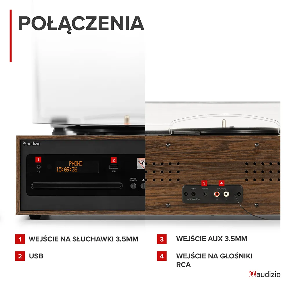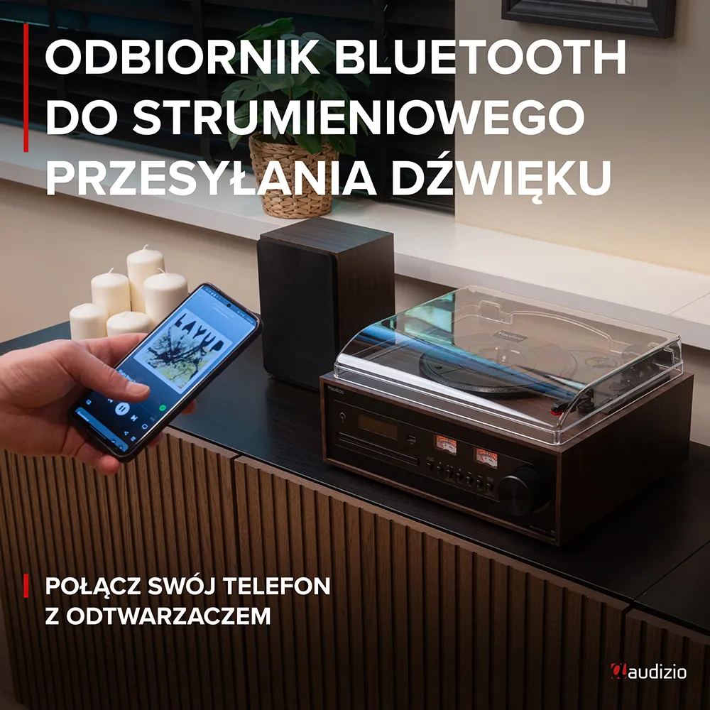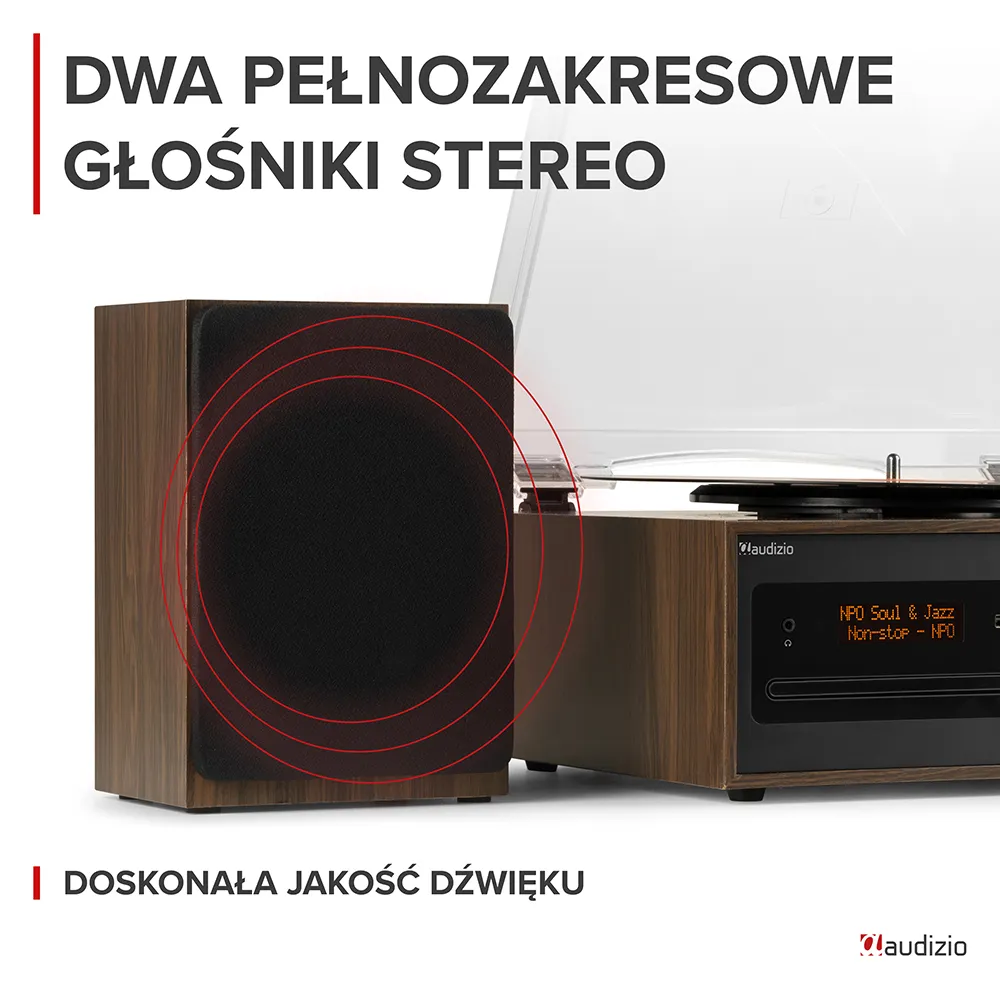 - Opcje odtwarzania: streaming BT, płyta winylowa, CD, USB, radio DAB+, wejście liniowe