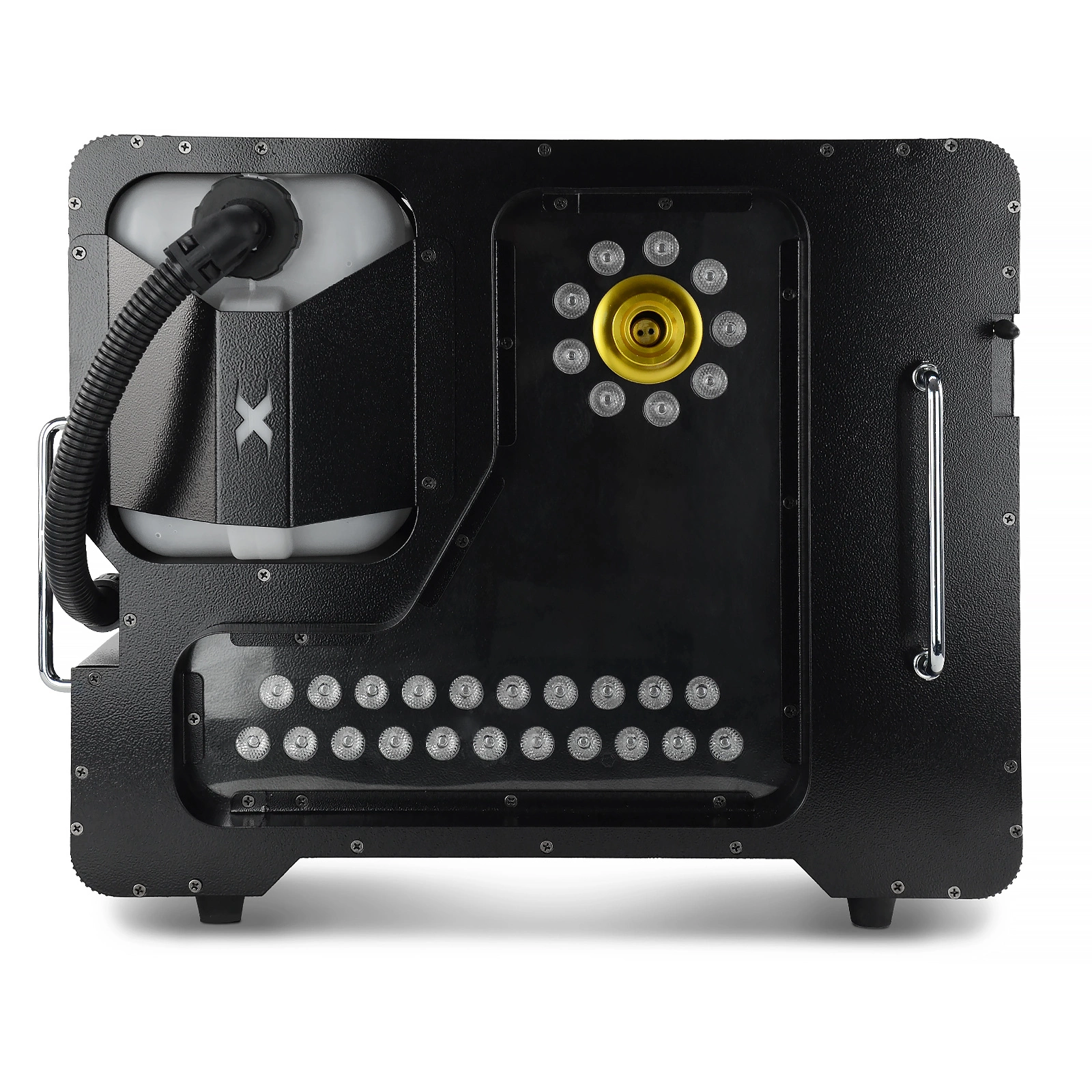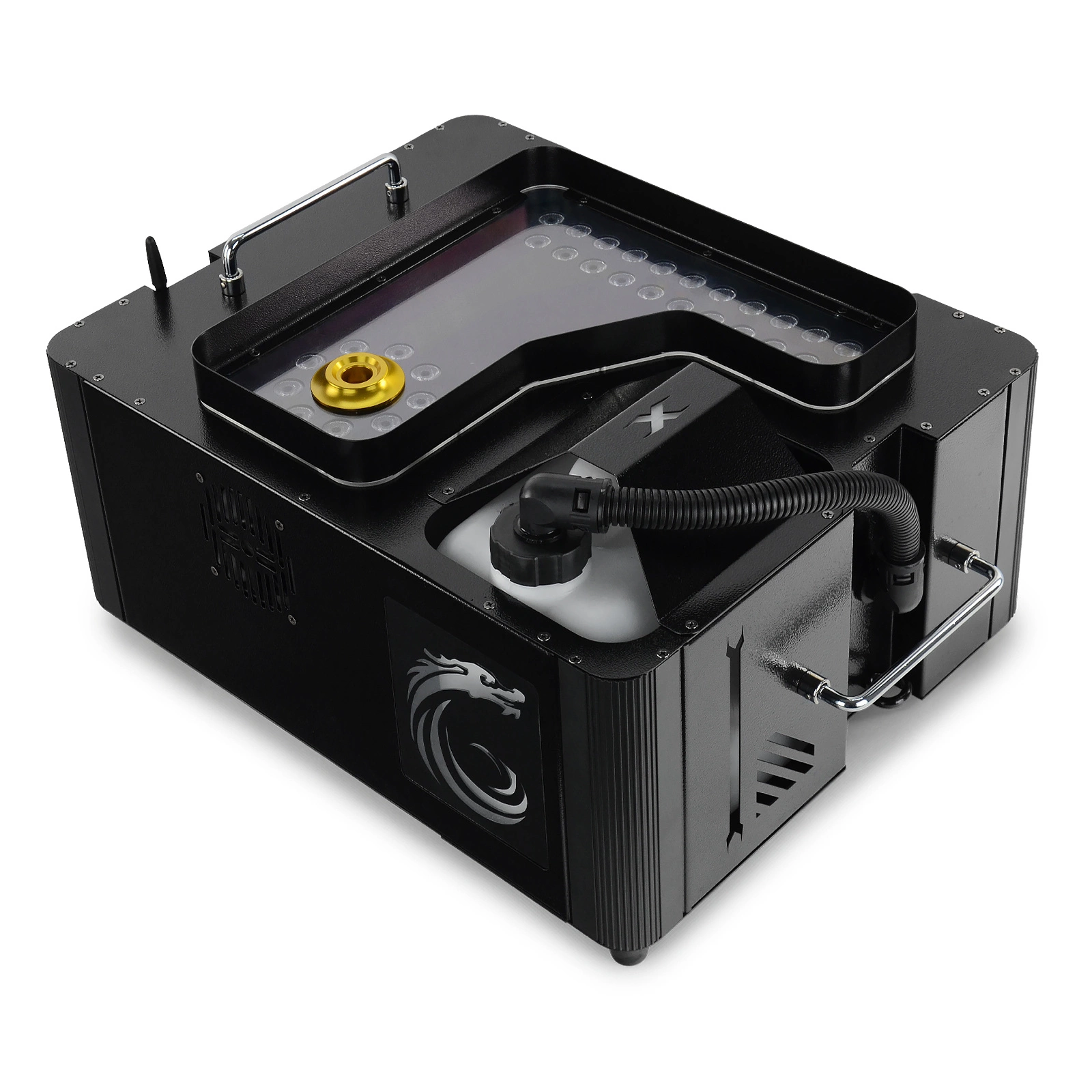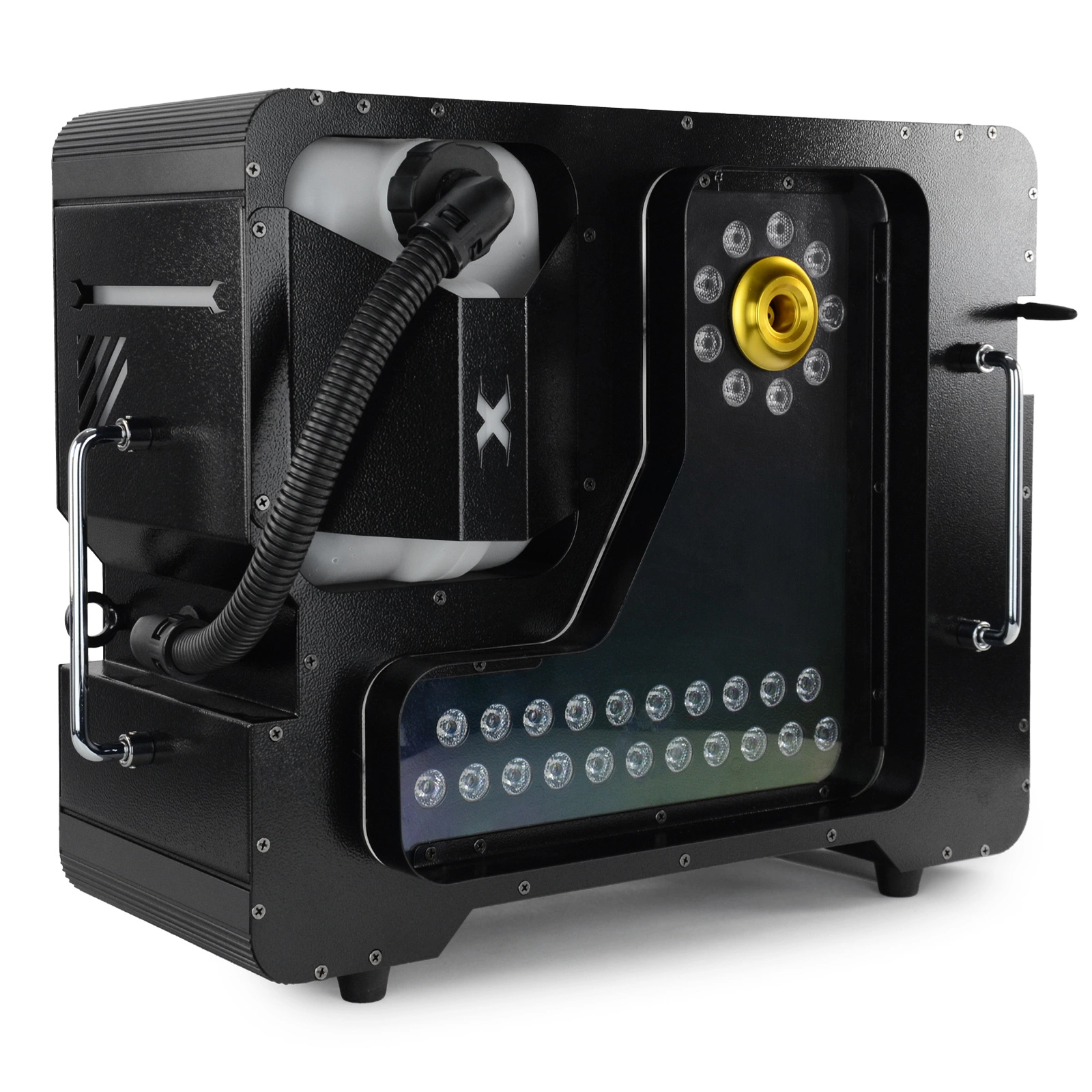 Urządzenie wyposażono w 24 wydajne diody LED RGB 3w1 (kolor czerwony, zielony i niebieski w jednej diodzie), które podświetlają wydmuchiwany dym, tworząc efekt ognistej kolumny światła i pary. Dzięki temu uzyskujemy intensywne, kolorowe iluminacje z możliwością miksowania kolorów, które w połączeniu z wyrzutem dymu na wysokość 10–15 metrów robią niesamowite wrażenie na widzach. Podświetlany zbiornik oraz nowoczesny design wzmacniają efekt estetyczny i funkcjonalny.