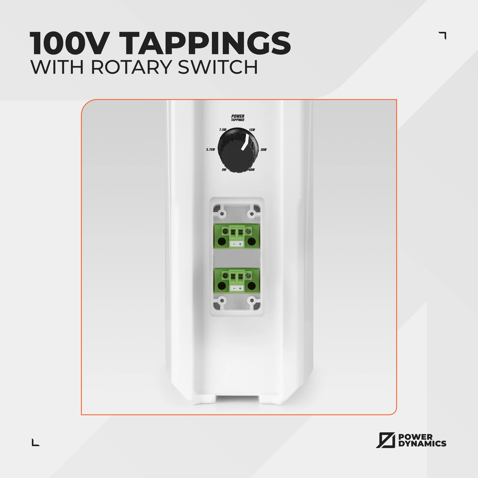 Model PDCS403V marki Power Dynamics to kolumnowy głośnik przeznaczony do instalacji 100V. Największą zaletą takich systemów jest możliwość podłączenia wielu głośników szeregowo przy minimalnych stratach sygnału. Głośnik wyposażony jest w cztery 3-calowe głośniki niskotonowe oraz 1-calowy neodymowy tweeter. Razem oferują one pasmo przenoszenia od 80 Hz do 20 000 Hz. Dzięki przełącznikowi mocy można łatwo dostosować ustawienie głośnika do konkretnych potrzeb (do wyboru: 3,75 W, 7,5 W, 15 W, 30 W lub 60 W).