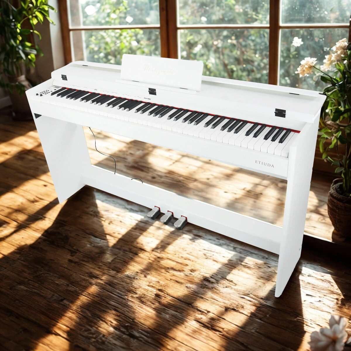 Etiuda to kompaktowe, cyfrowe pianino marki Mielczewski, wyposażone w pełnowymiarową klawiaturę z 88 czułych na dotyk klawiszy o standardowej wadze. Ten nowoczesny, biały instrument doskonale sprawdzi się zarówno u osób początkujących, jak i bardziej zaawansowanych muzyków. Rozbudowany, bogaty zestaw funkcji i możliwości personalizacji czyni z niego świetny wybór do codziennej nauki i twórczej pracy w domu.