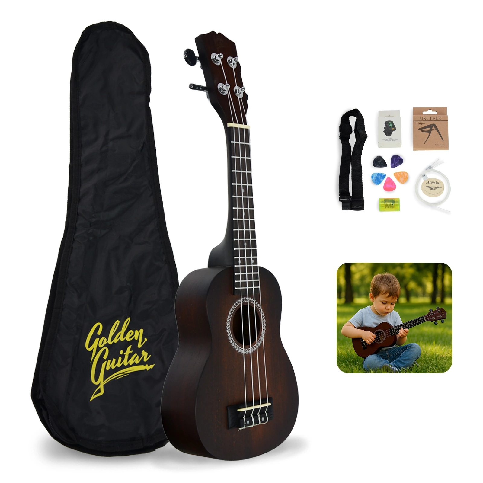 Ukulele Golden Guitar brązowe + akcesoria pokrowiec tuner kapodaster kostki