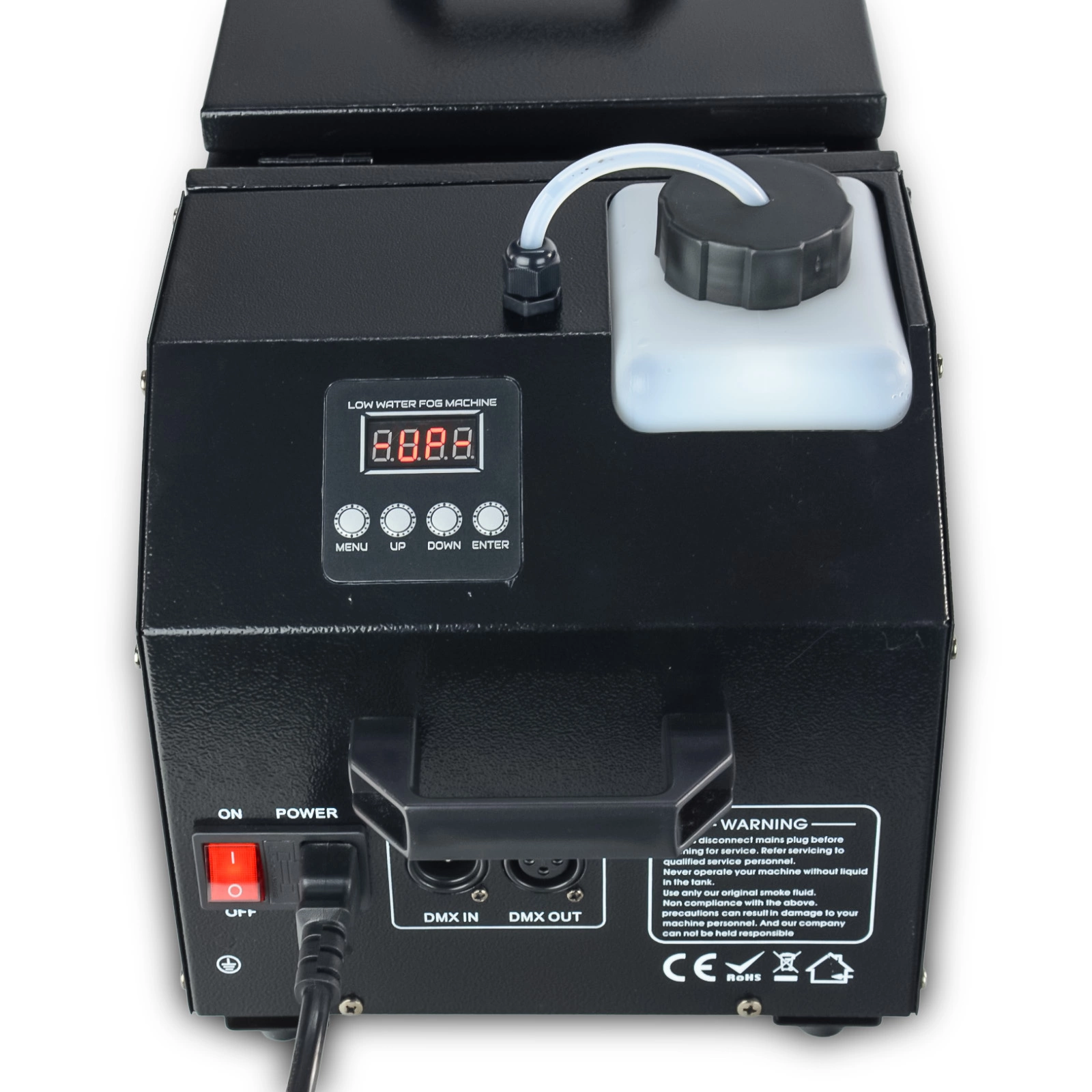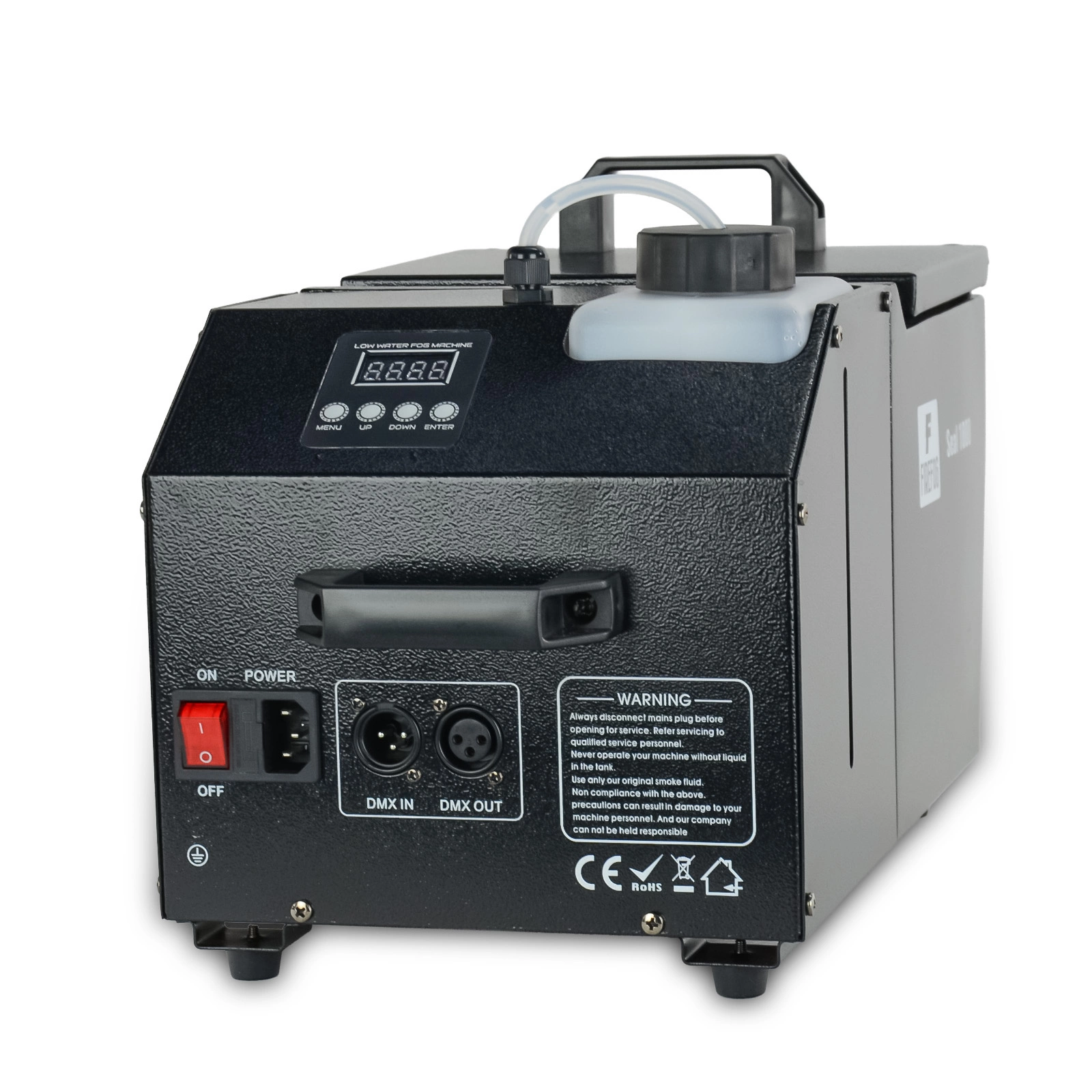 - Maszyna wykorzystuje zwykły płyn do dymu oraz wodę i wytwarza nisko zawieszony dym za pomocą technologii ultradźwiękowej. Dlatego suchy lód lub CO2 nie są konieczne, aby mgła przylegała do podłogi.