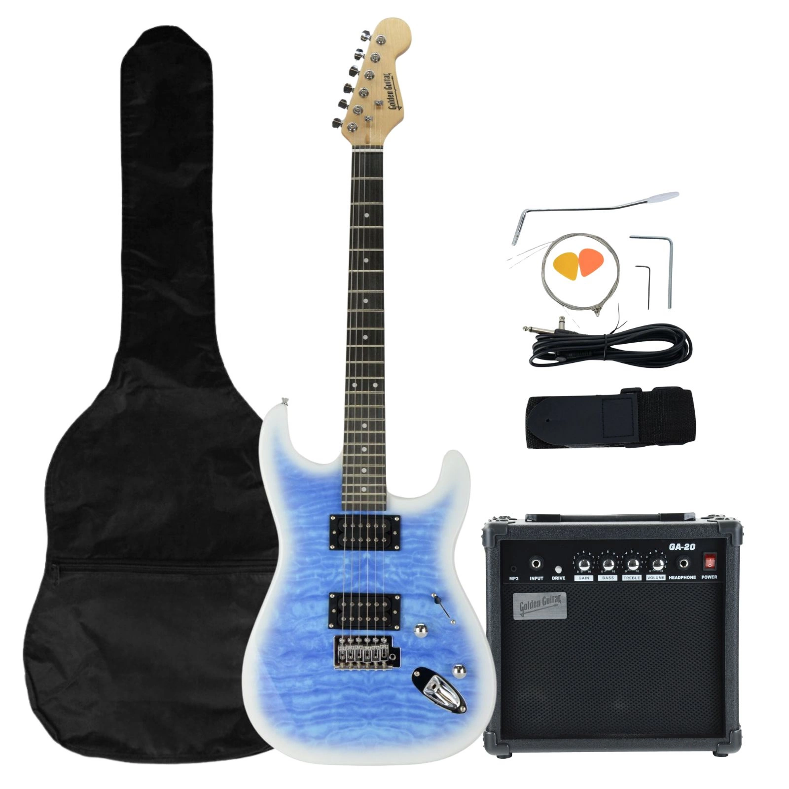 Golden Guitar STEG-35 to kompletny zestaw gitarowy w efektownym kolorze niebiesko-białym, idealny dla osób zaczynających przygodę z muzyką, jak i dla bardziej doświadczonych gitarzystów. W skład zestawu wchodzi solidna gitara elektryczna typu ST (Stratocaster), wzmacniacz o mocy 20W oraz pełen zestaw akcesoriów: wygodny pokrowiec Oxford, regulowany pasek, kostka, kabel jack–jack, dodatkowe struny, tremolo oraz klucz imbusowy. Już po wyjęciu z opakowania zestaw jest gotowy do gry – wystarczy tylko podłączyć gitarę do dołączonego wzmacniacza. Atrakcyjny, niebiesko-biały lakier na korpusie nadaje instrumentowi nowoczesny charakter, dzięki czemu wygląda on profesjonalnie i przyciąga wzrok na scenie czy podczas lekcji.