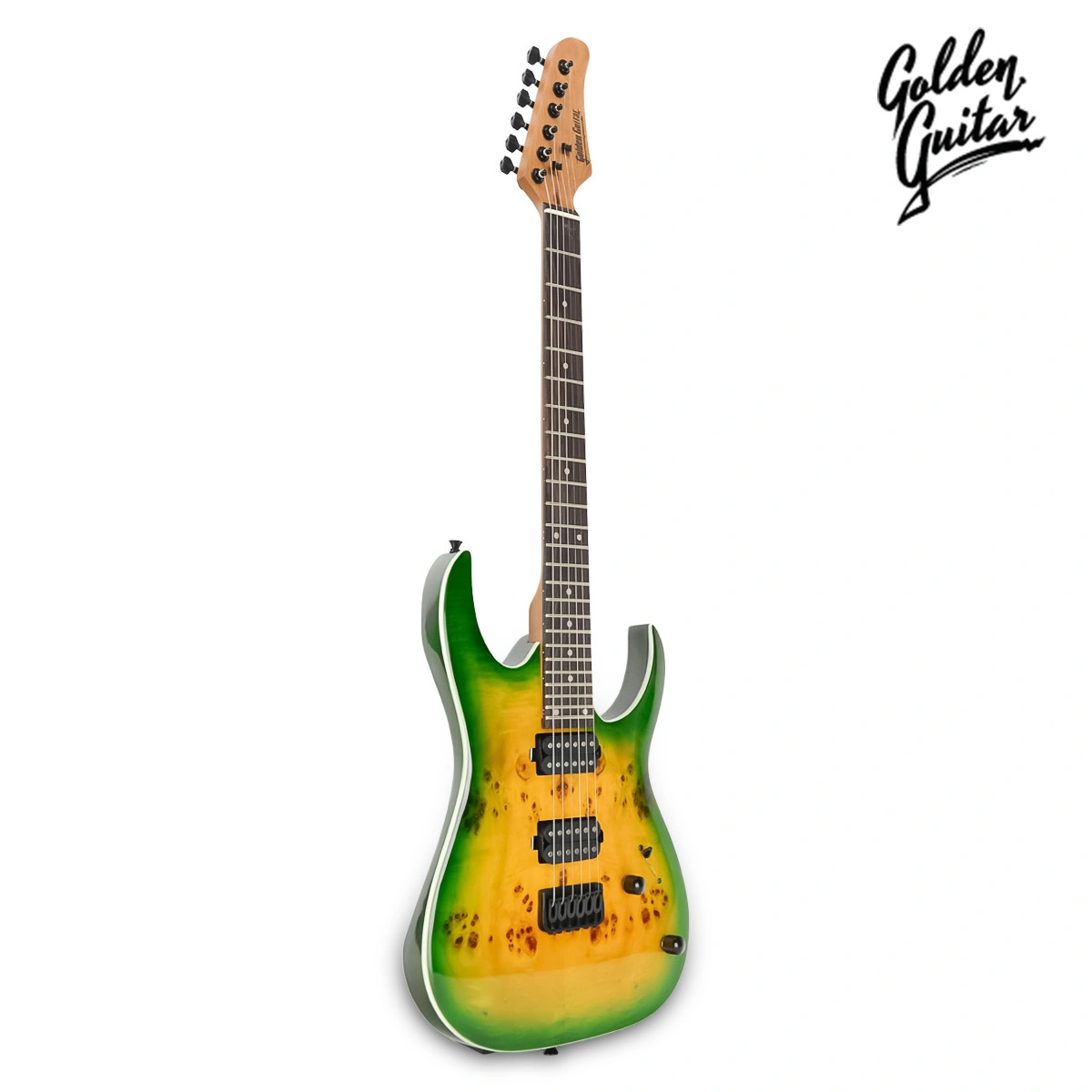 Gitara Golden Guitar PSG-3 przyciąga uwagę już na pierwszy rzut oka. Zielone wykończenie korpusu z rysunkiem drewna oraz nowoczesne, odważne warianty kolorystyczne nadają instrumentowi charakteru scenicznego. Każdy egzemplarz ma swój indywidualny wygląd dzięki niepowtarzalnym słojom drewna.