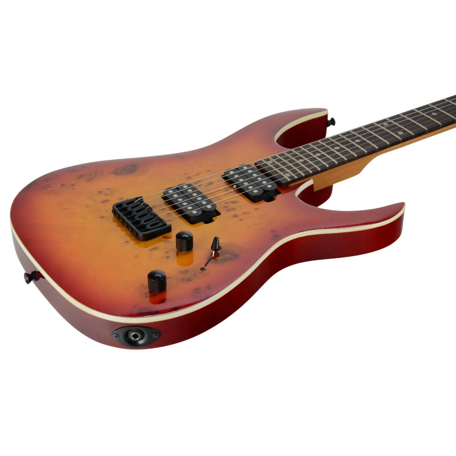 Gitara Golden Guitar PSG-3 przyciąga uwagę już na pierwszy rzut oka. Wiśniowe wykończenie korpusu z rysunkiem drewna oraz nowoczesne, odważne warianty kolorystyczne nadają instrumentowi charakteru scenicznego. Każdy egzemplarz ma swój indywidualny wygląd dzięki niepowtarzalnym słojom drewna.