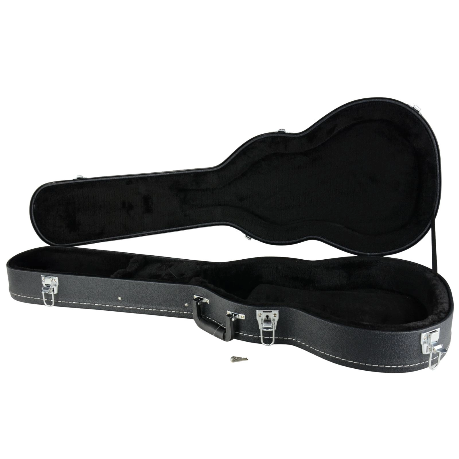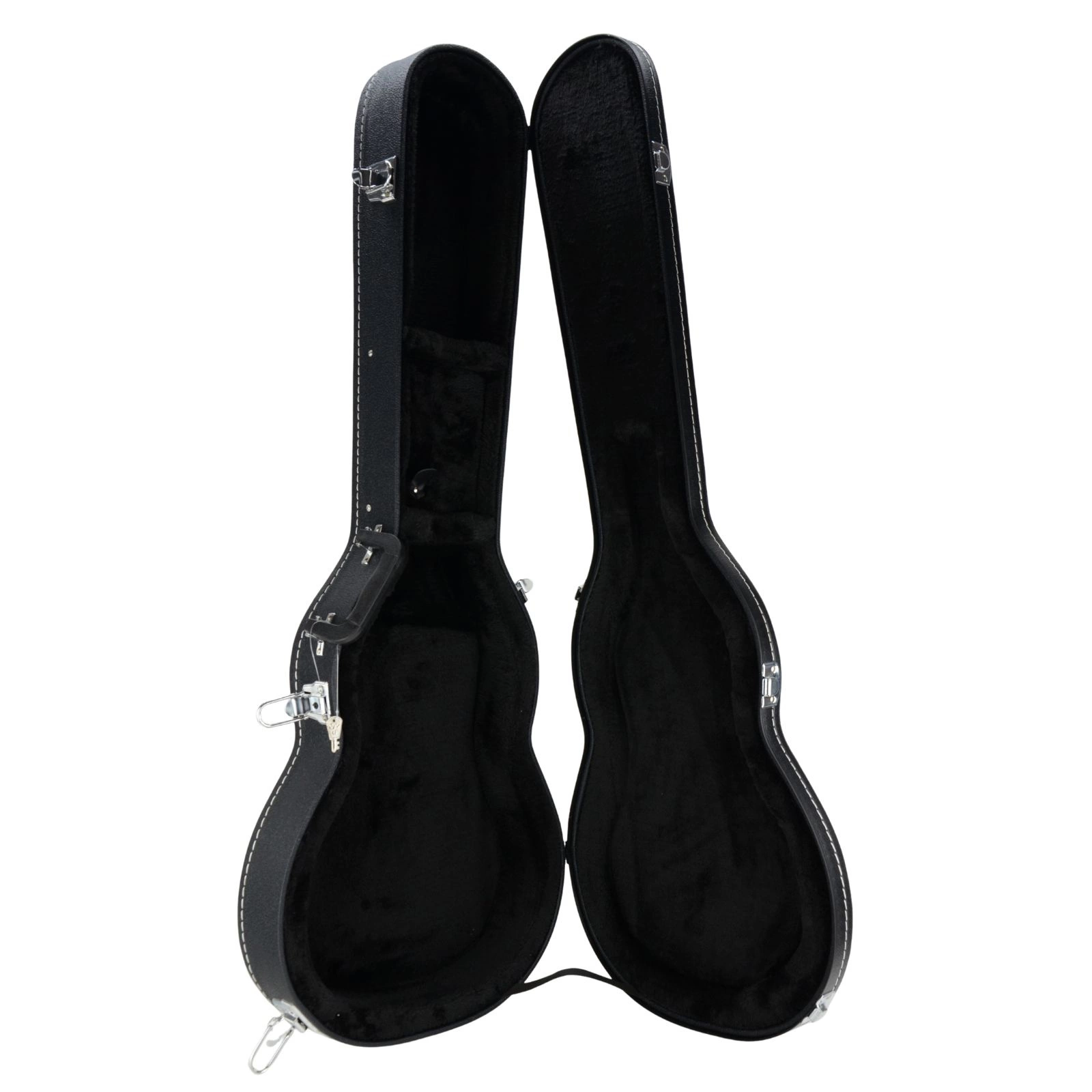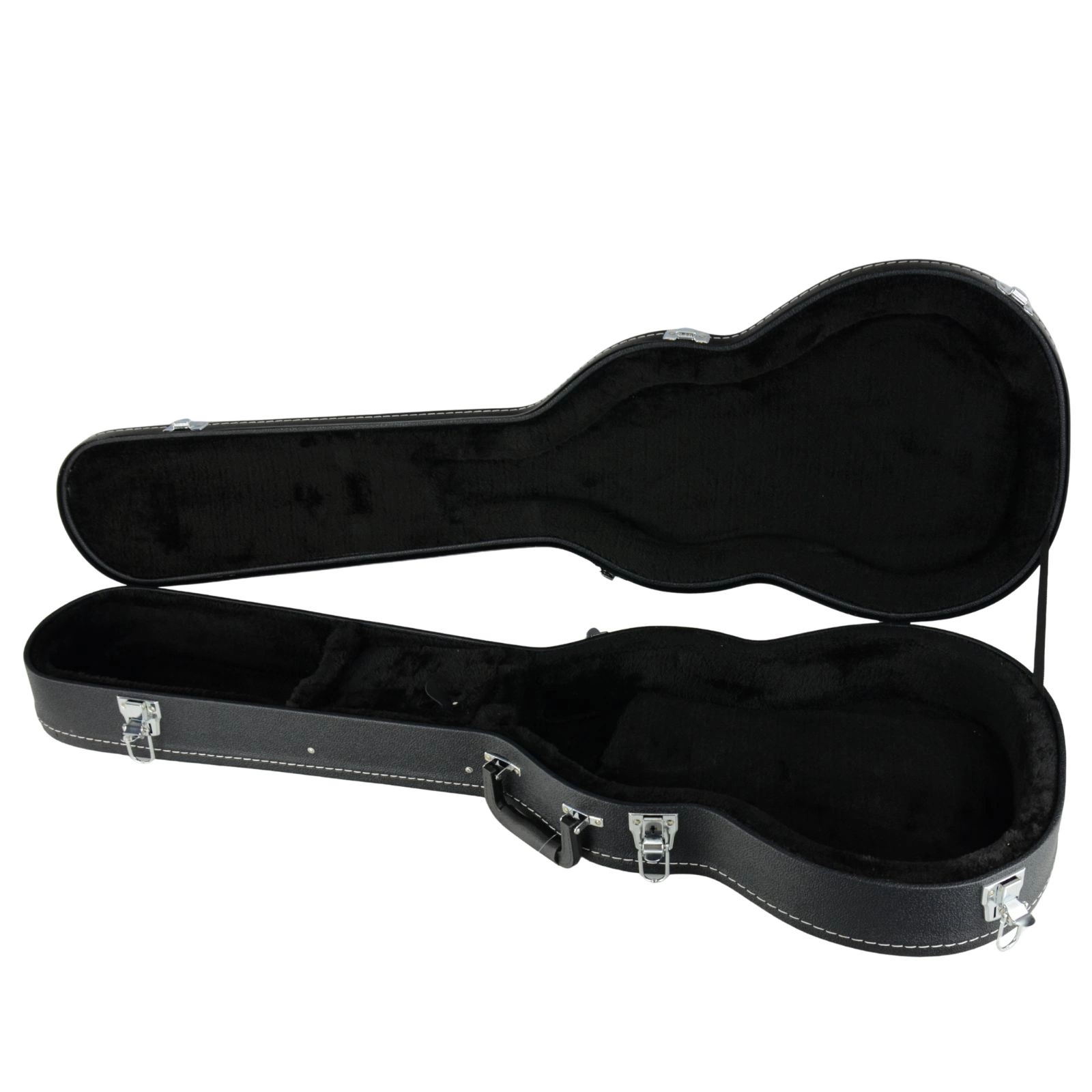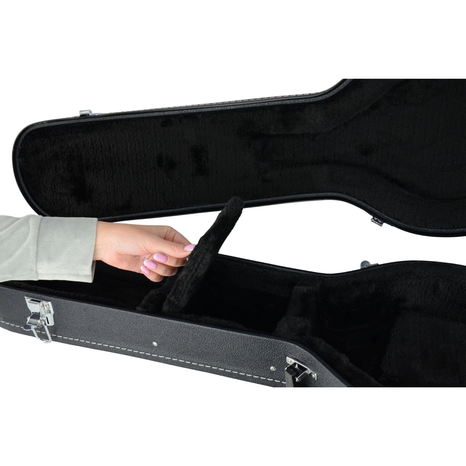 Wnętrze wykończone miękkim, czarnym pluszem idealnie dopasowuje się do kształtu gitary, chroniąc ją przed zarysowaniami i przesuwaniem się.