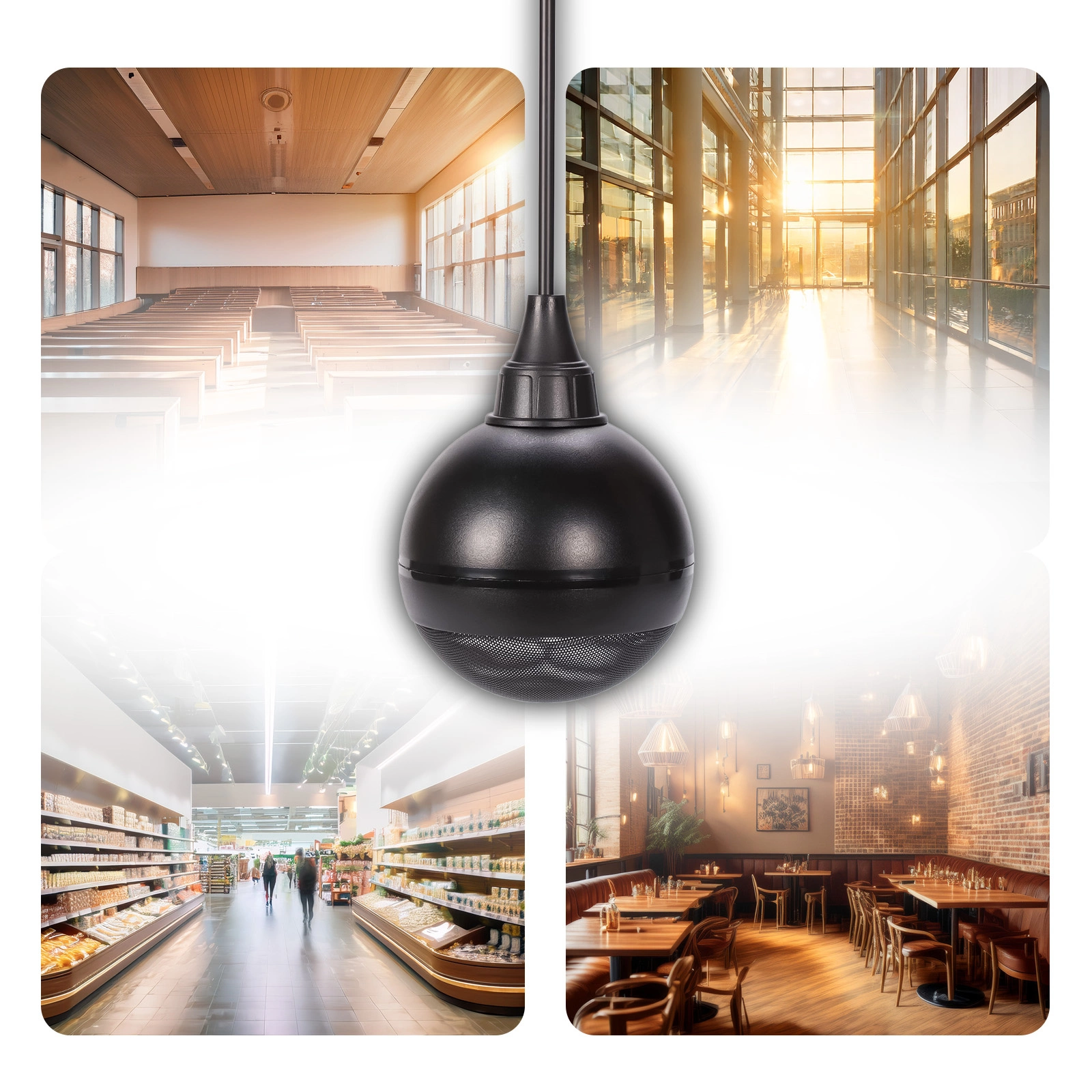 - supermarkety i galerie handlowe – równomierne nagłośnienie dużych powierzchni,