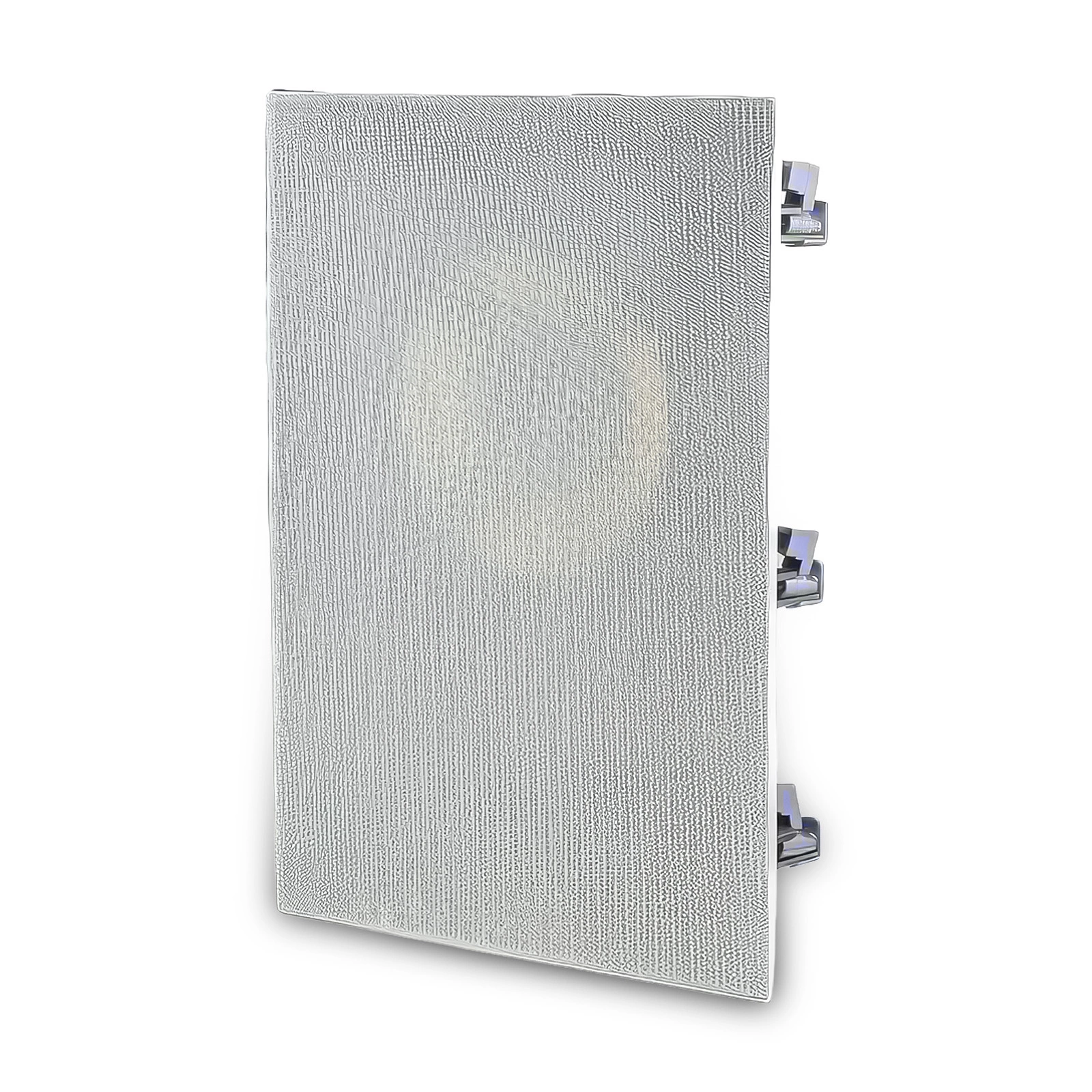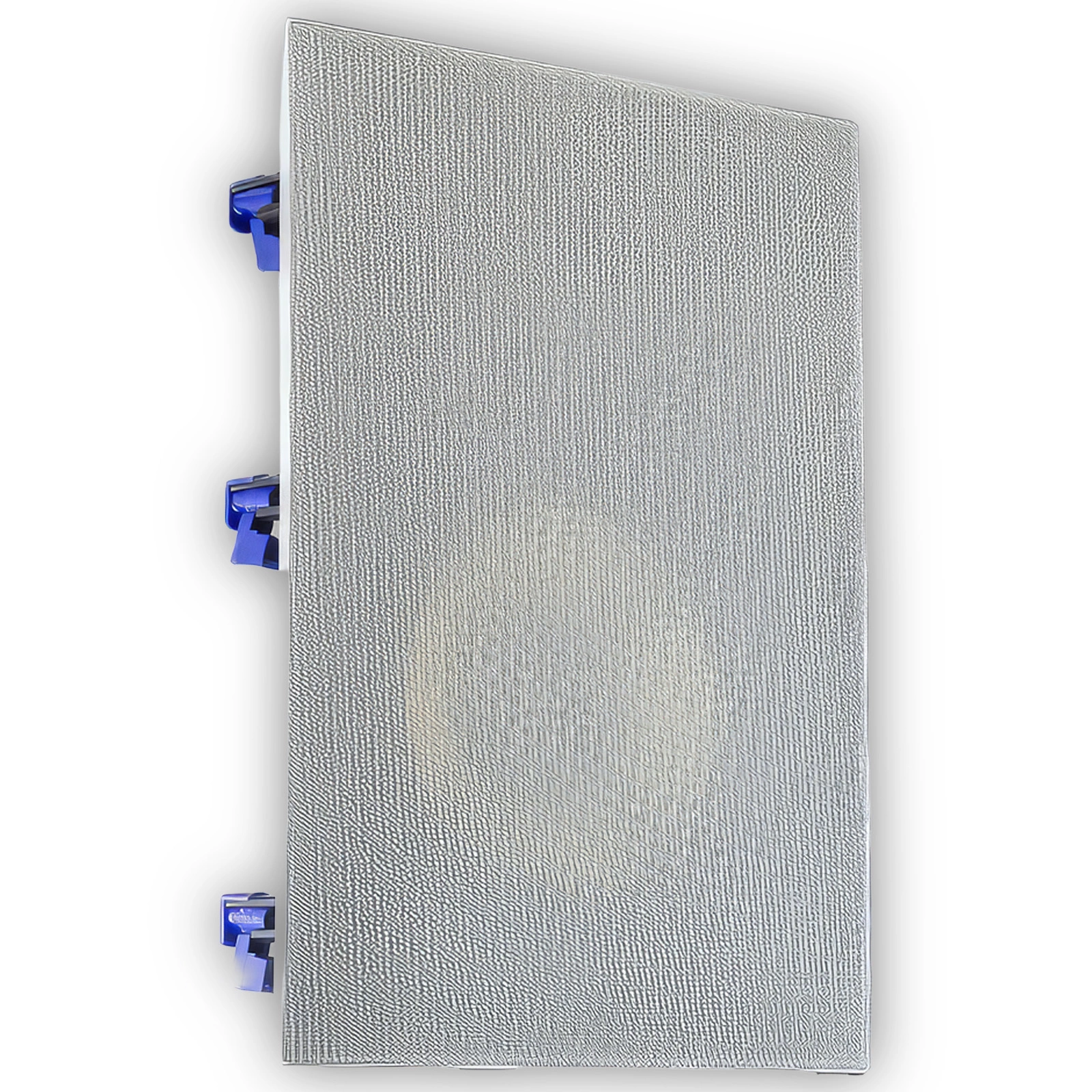 Bezramowa, magnetyczna maskownica w kolorze białym pozwala na estetyczny montaż w ścianie, suficie lub obudowie kolumny, zachowując minimalistyczny, nowoczesny wygląd.