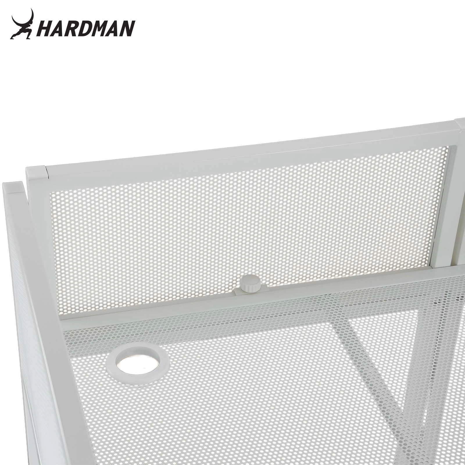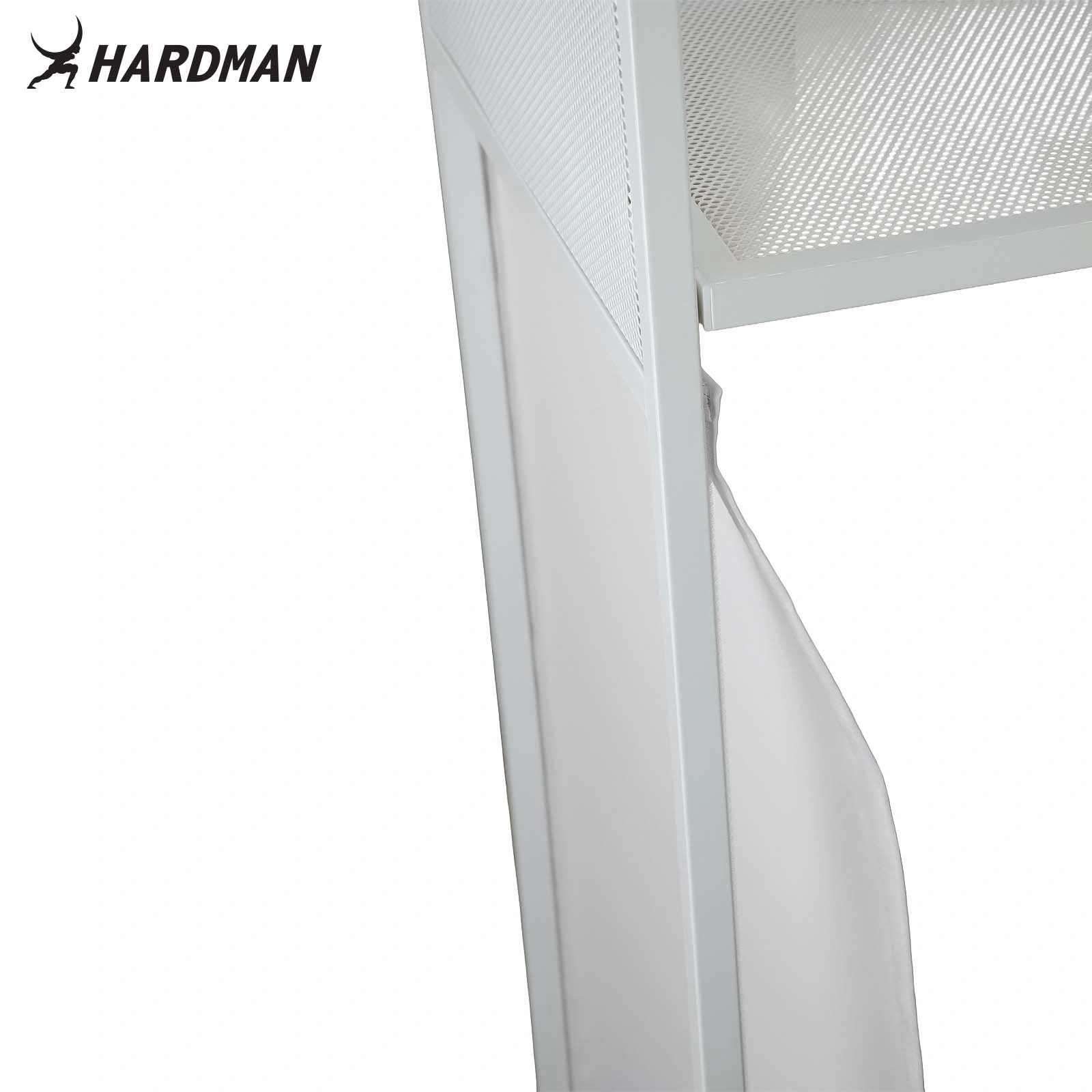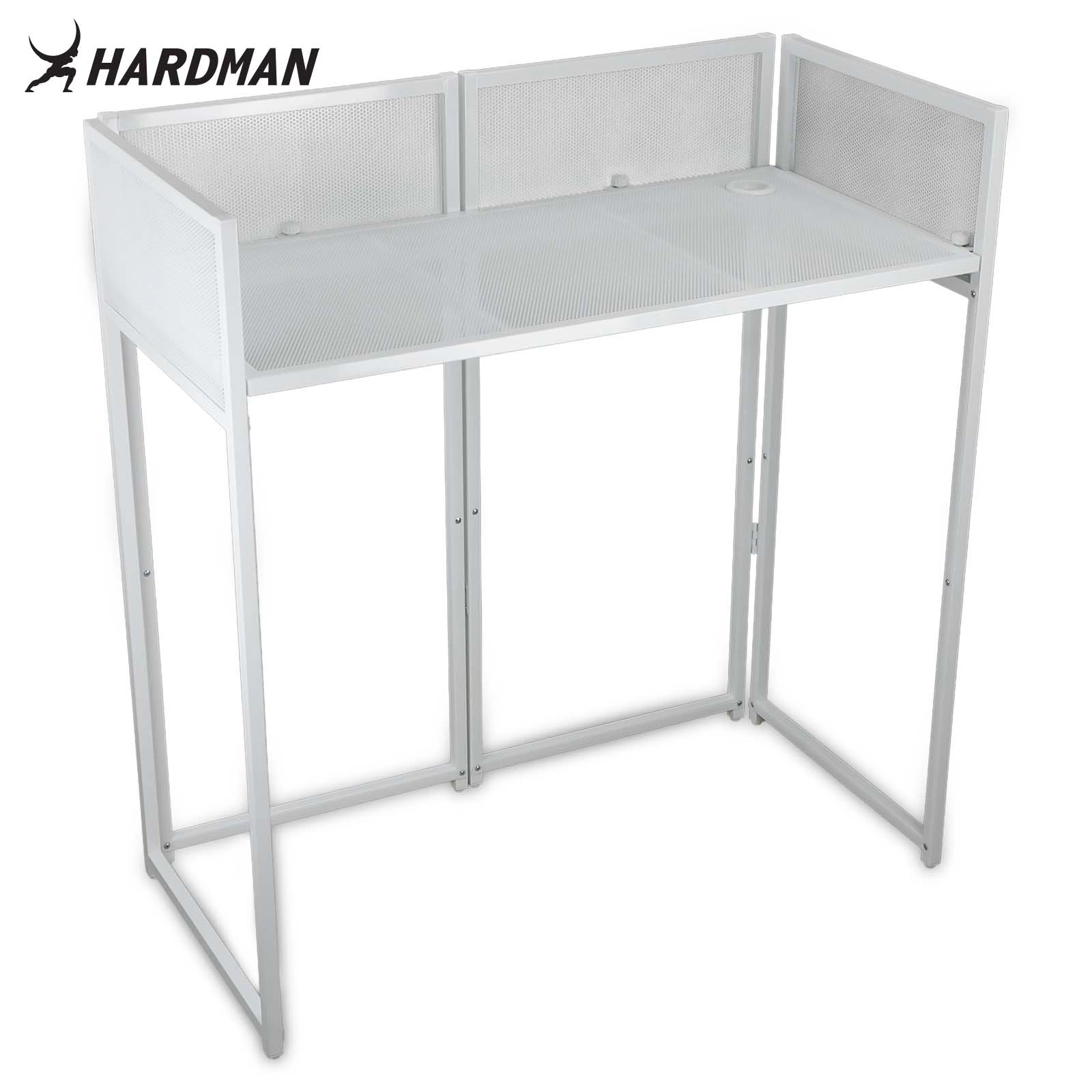 Konstrukcja została wykonana ze stali malowanej proszkowo, co gwarantuje trwałość i stabilność. W zestawie znajduje się blat z siatki z otworami na kable oraz scrim-lycra trudnopalna (biała), która efektownie maskuje sprzęt i przewody.