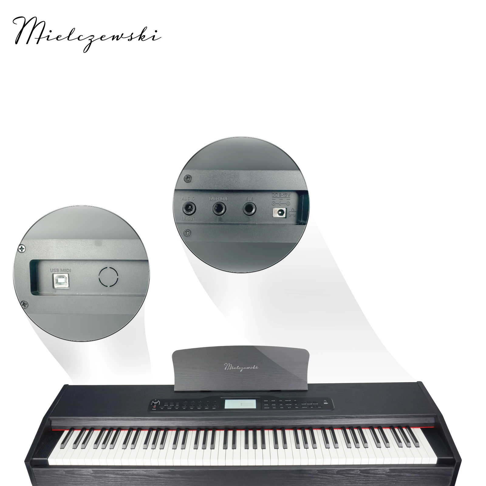 - Klawiatura: 88 klawiszy, ważona (mechanizm młoteczkowy, hammer action)