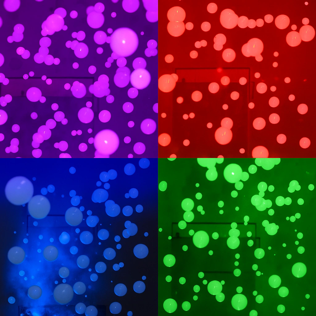 Urządzenie wyposażono w 24 jasne diody LED RGBW, które okalają otwory wyjściowe. Dzięki temu dym i bańki są dodatkowo podświetlane, co daje efekt sceniczny jak z profesjonalnych produkcji. Wytwornica baniek z oświetleniem LED sprawdzi się zarówno w małych salach, jak i na dużych scenach.