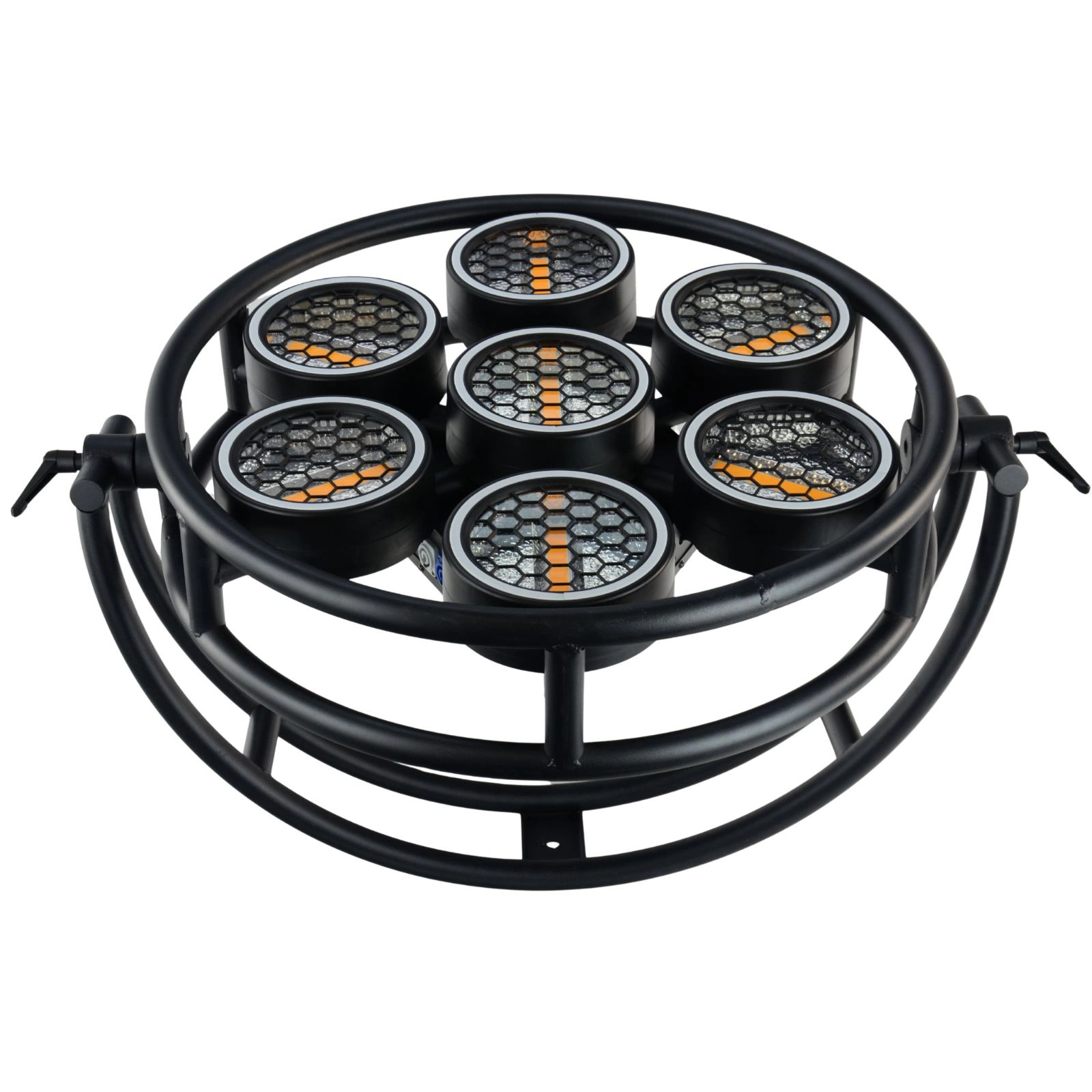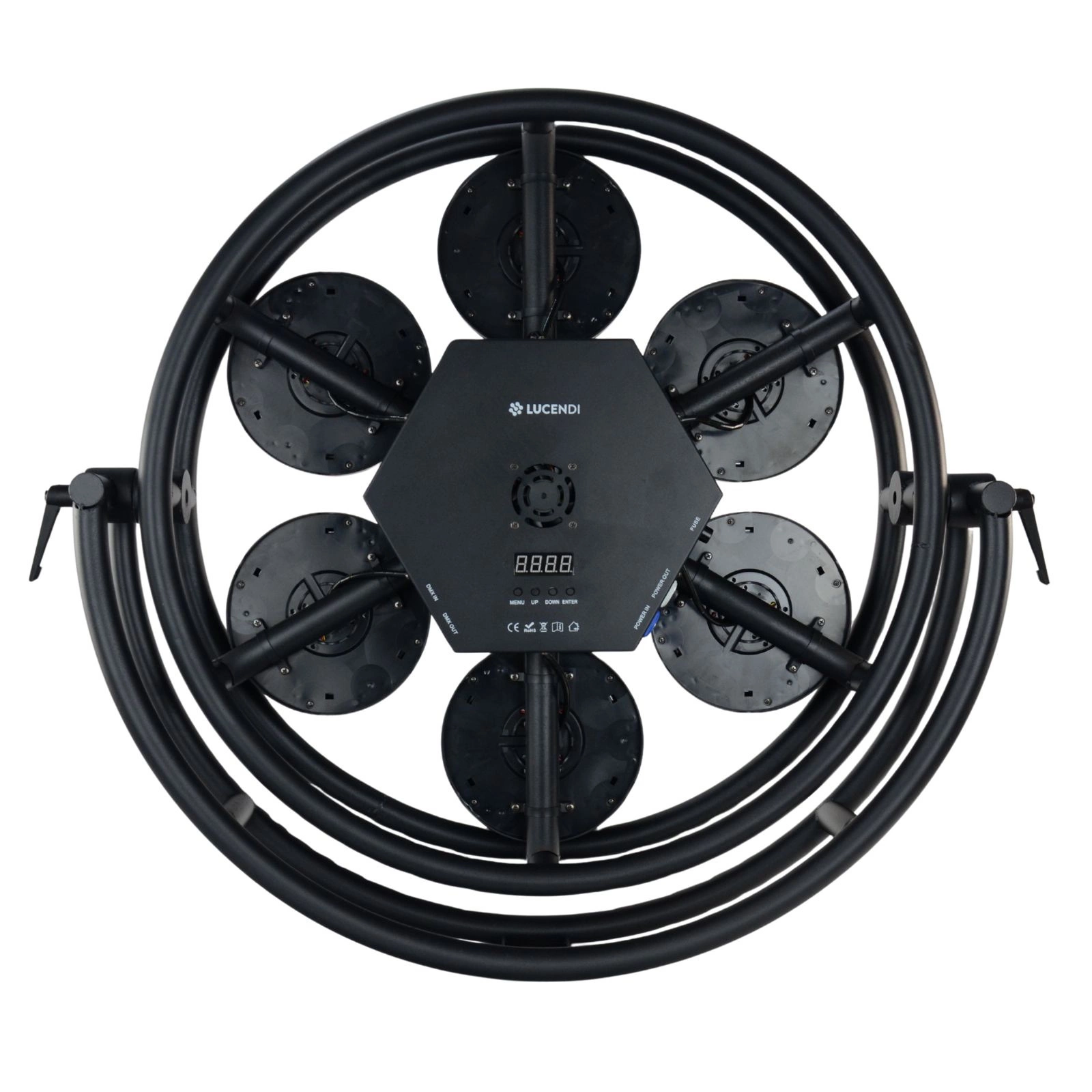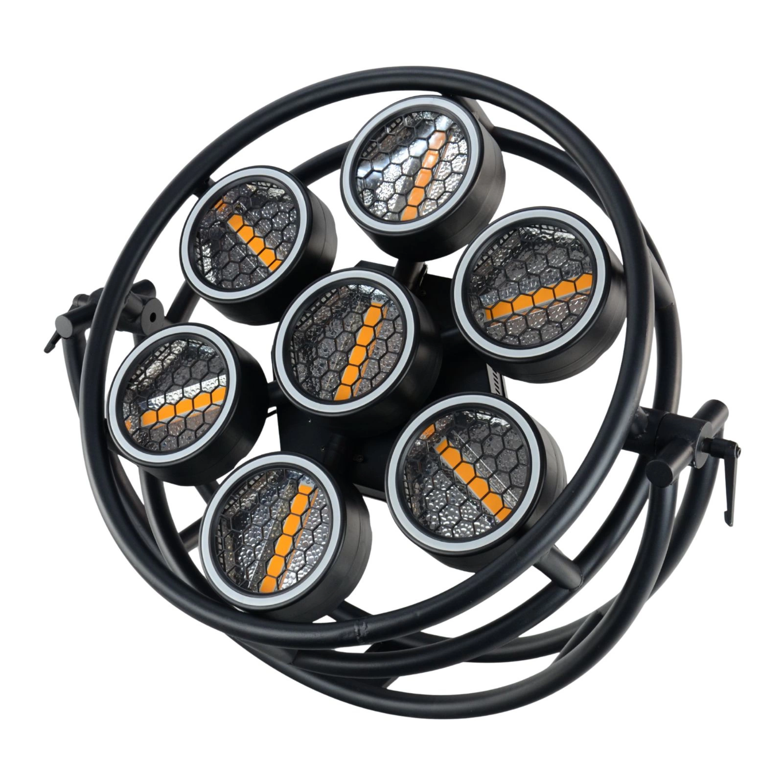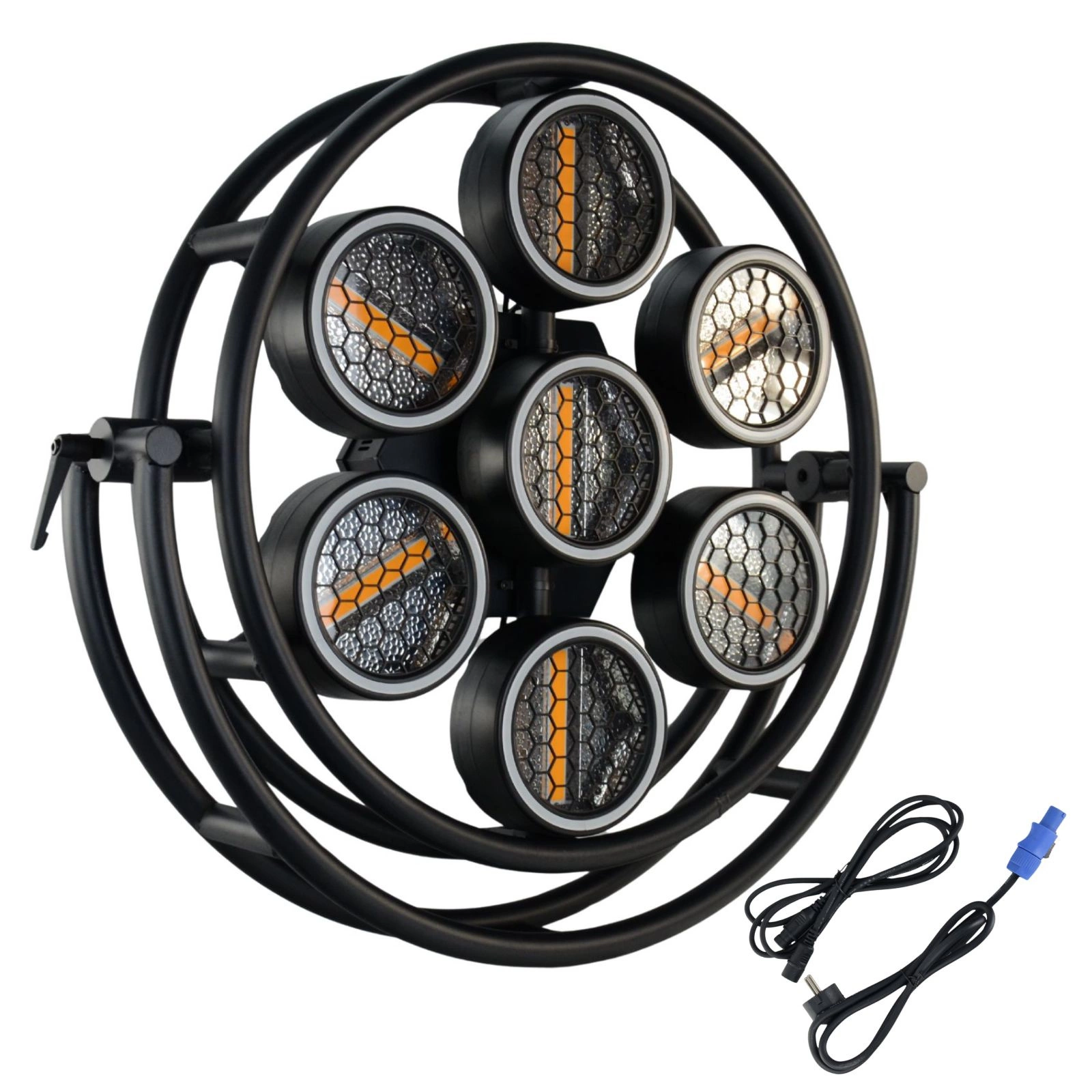 224 diody LED RGB (typ 5050) + 7 COB LED (ciepła biel) + 30 diod LED w paskach = połączenie intensywnych kolorów z klasycznym ciepłym światłem scenicznym.