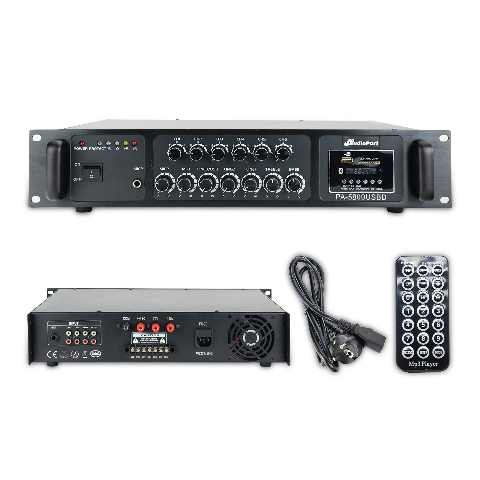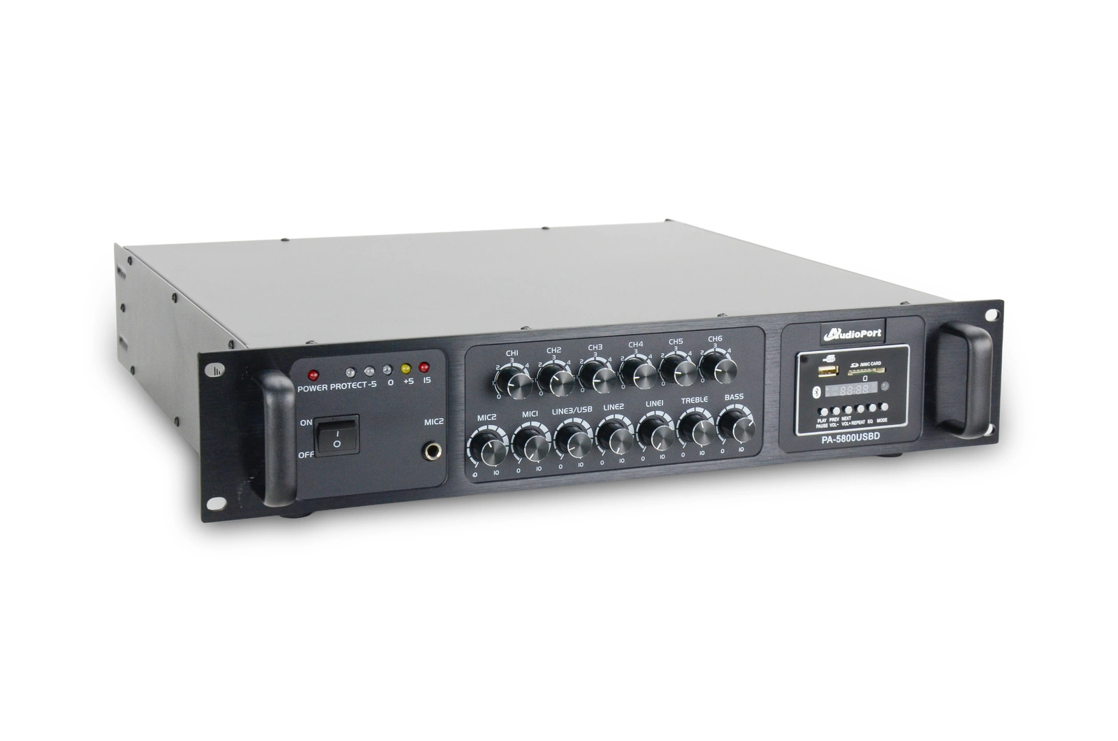 Audioport PA-5800 to profesjonalny wzmacniacz z Bluetooth o mocy 800W, zaprojektowany specjalnie do pracy w systemach nagłośnienia 100V. Łączy w sobie funkcje klasycznego wzmacniacza audio, miksera oraz odtwarzacza multimedialnego, co sprawia, że jest idealnym rozwiązaniem do szkół, biur, centrów handlowych, supermarketów i obiektów przemysłowych.