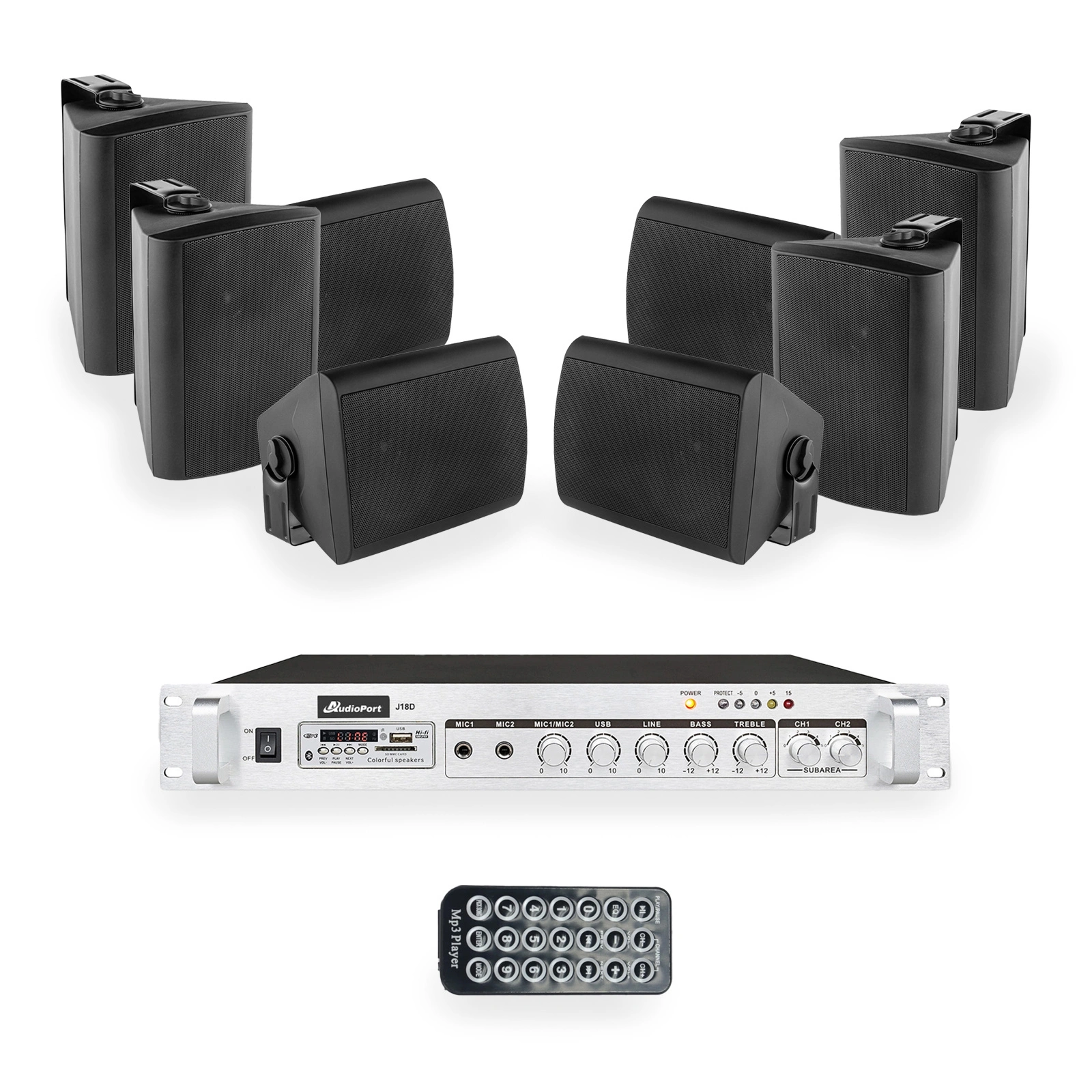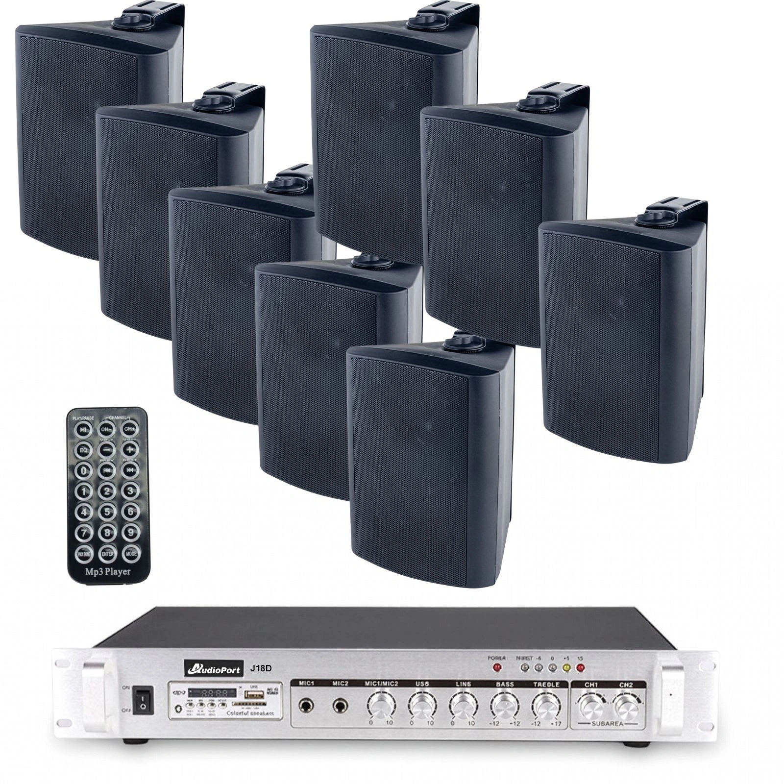 W skład zestawu wchodzi wydajny wzmacniacz 180W / 100V oraz 8 czarnych, 4-calowych głośników naściennych, które razem tworzą spójny i bezproblemowy system audio. Idealnie sprawdzi się zarówno do odtwarzania muzyki w tle, jak i do przekazywania komunikatów.