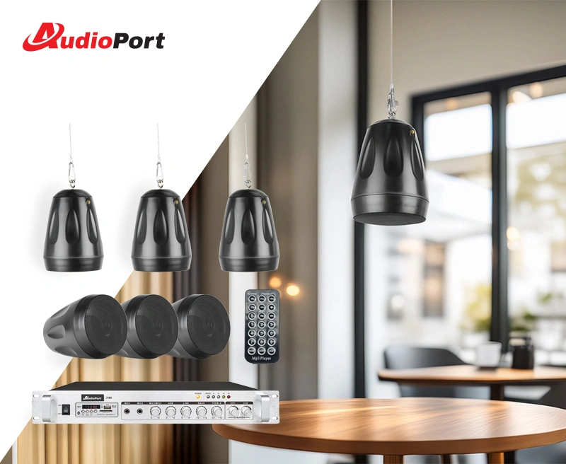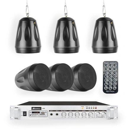 W zestawie znajduje się wzmacniacz 180W (system 100V) oraz 6 czarnych głośników wiszących, które zapewniają równomierny dźwięk w całym pomieszczeniu. Takie głośniki idealnie pasują do nowoczesnych wnętrz i dobrze grają nawet w dużych lub wysokich pomieszczeniach.