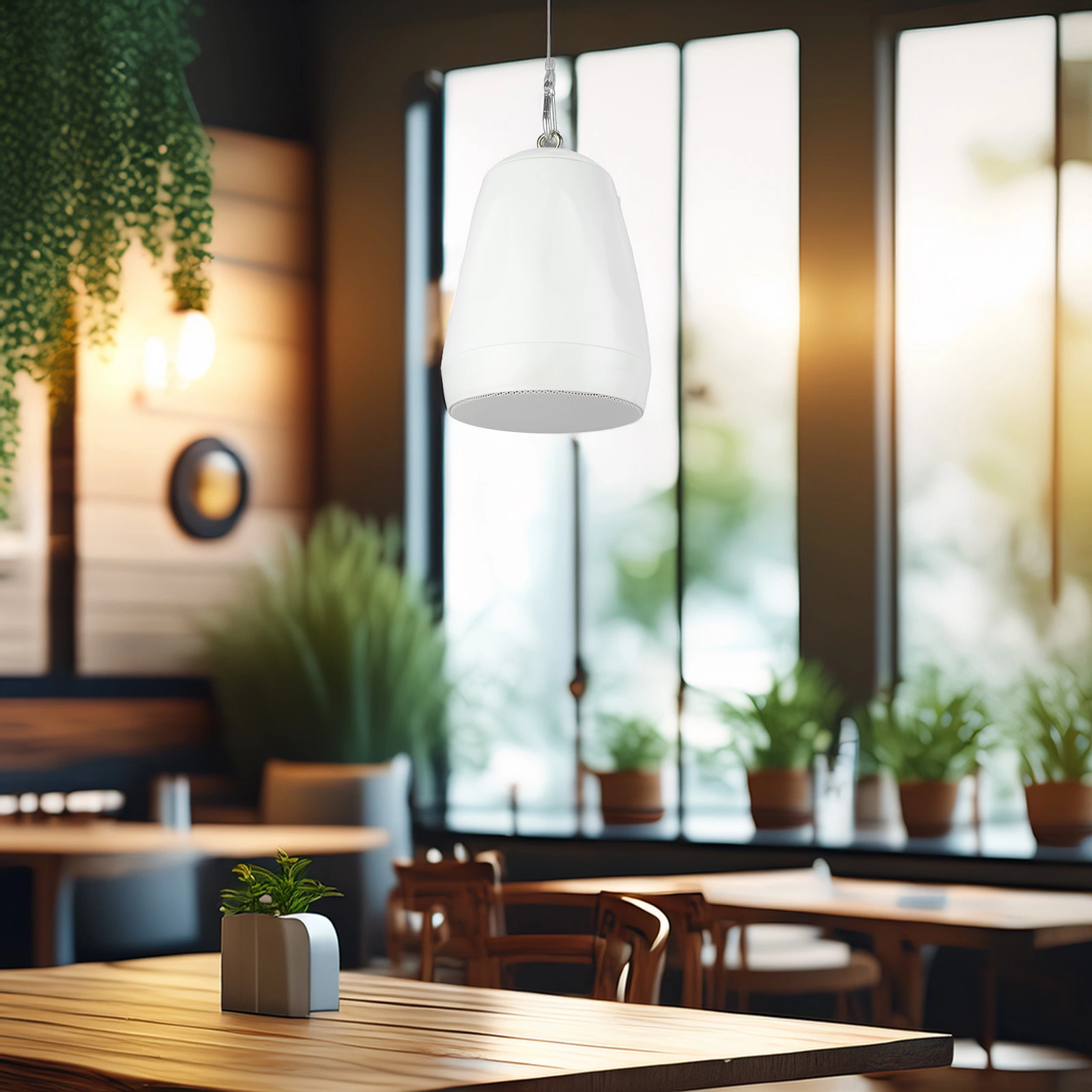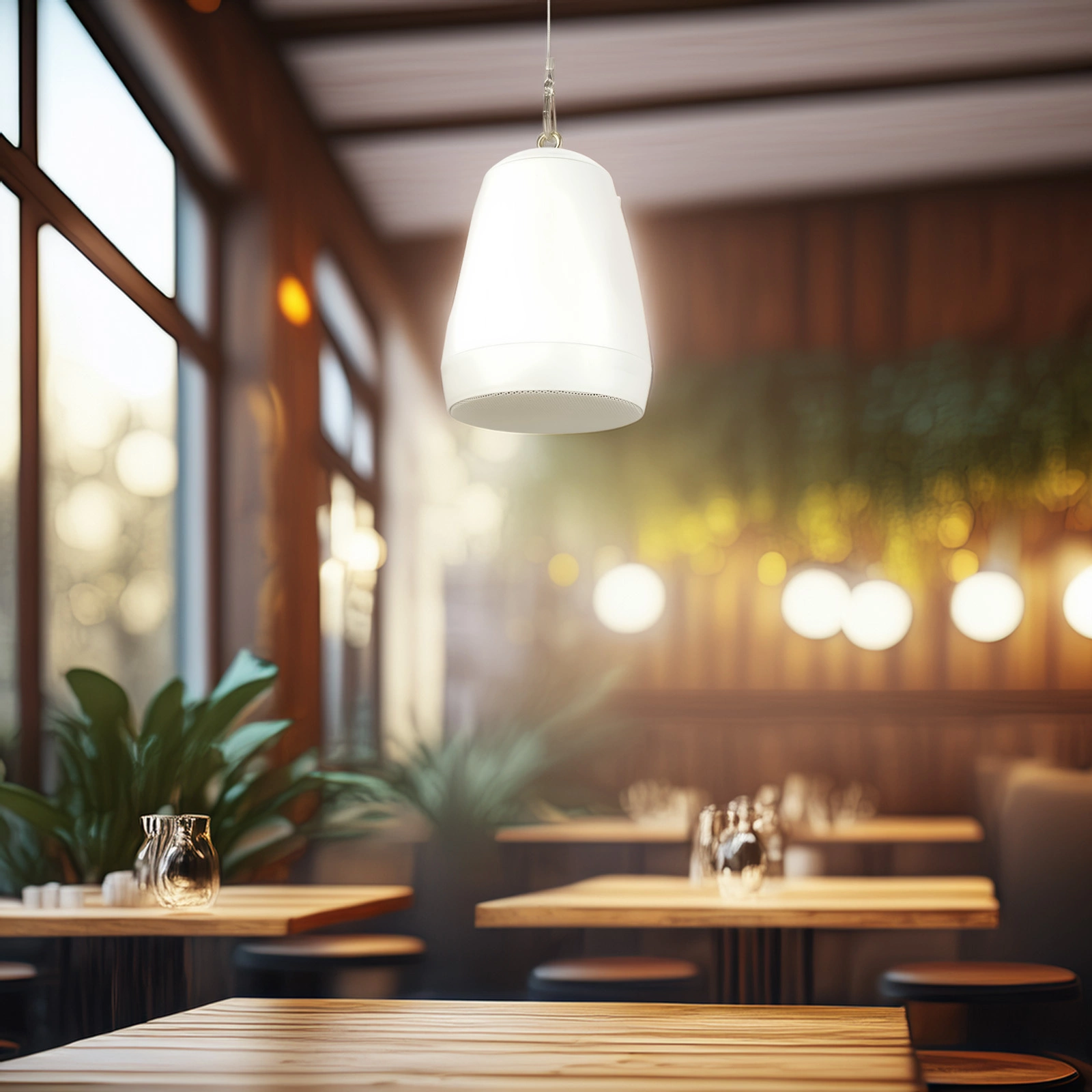 Obudowa z wytrzymałego tworzywa ABS jest odporna na uszkodzenia i dobrze wygląda nawet po długim czasie użytkowania. Prosty, nowoczesny kształt sprawia, że głośnik dyskretnie wpasowuje się w wystrój wnętrza, a forma wisząca pozwala równomiernie rozprowadzić dźwięk w całym pomieszczeniu – szczególnie w lokalach z wysokim sufitem.